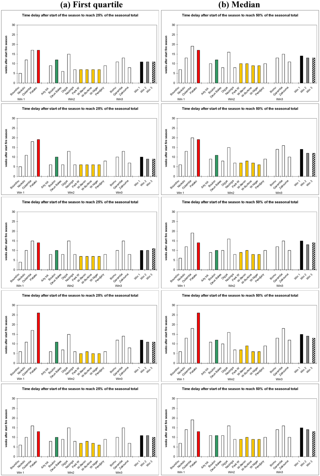 Fire distribution in Patako (red), Boulon (green), Park W (orange) and other 11 protected areas of West and Central Africa from 2004 to 2009. Number of weeks from the start of the burning season to reach 25% of the seasonal total (a) and 50% (b).