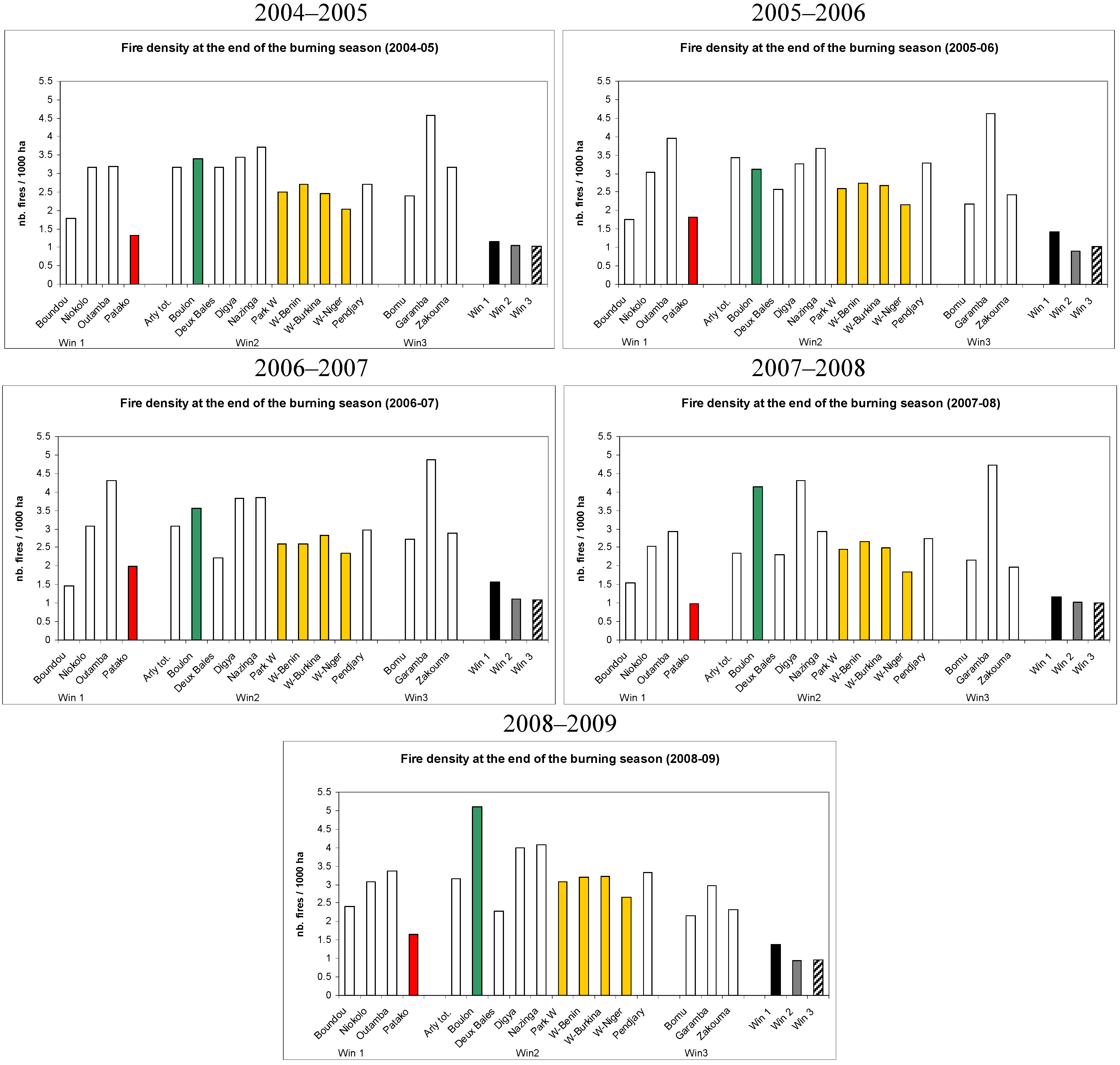 Fire density (nb. fire pixels/1,000 ha) in Patako (red), Boulon (green), Park W (orange) and other 11 protected areas of West and Central Africa from 2004 to 2009. Fire density in the regional windows: window 1 (black), 2 (grey) and 3 (striped).