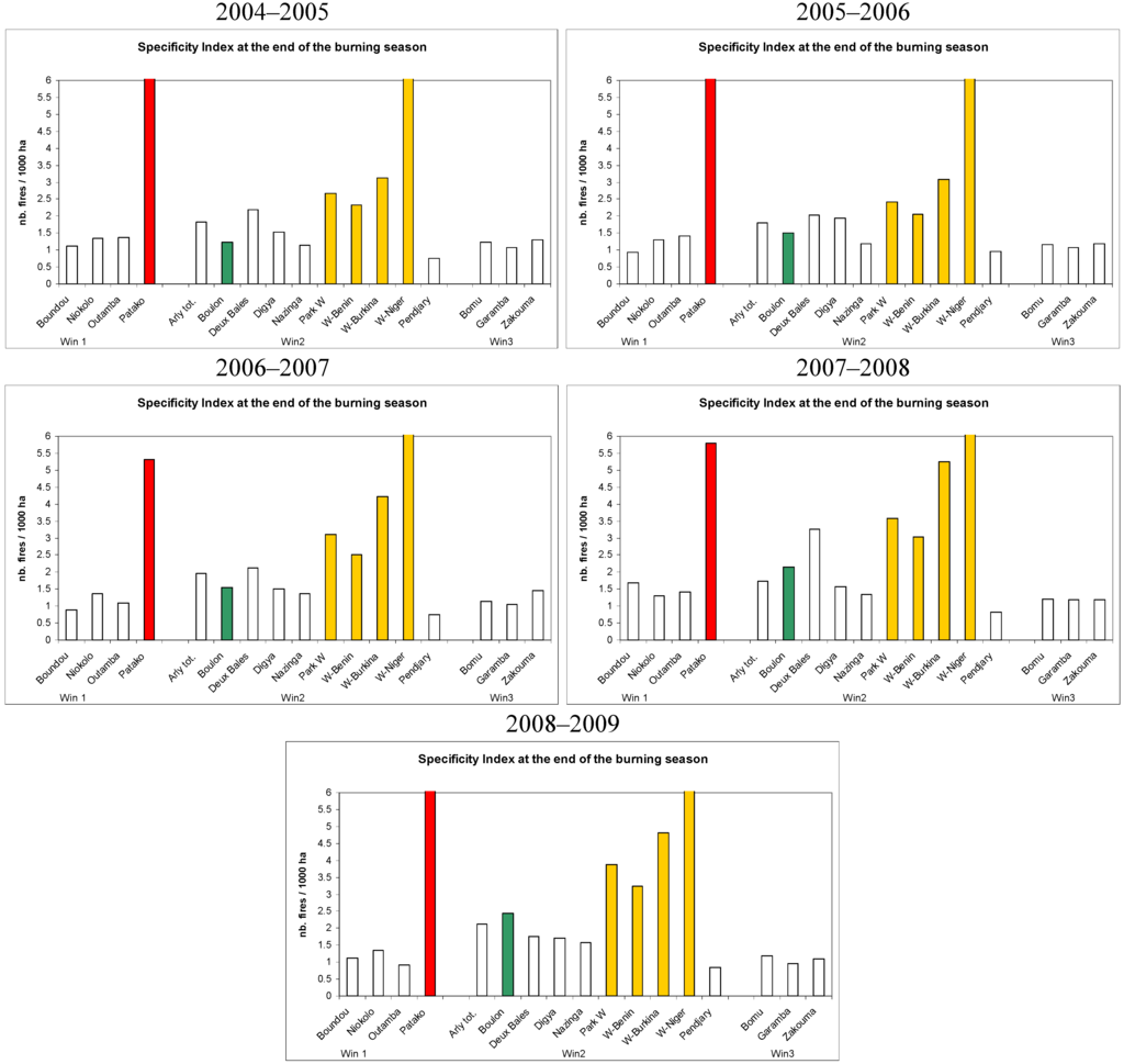 The evolution of the Boulon classified forest must be noted: its Specificity Index increases from 1.2, in 2004–05, to 2.5, in 2008–09. This means that the level of fire activity was more or less the same inside and outside the PA during the 2004–05 season, while five years later it is more than two times higher in the PA than in the surrounding buffer zone. In fact, the fire density has increased in the PA, from 3.4 to 5.1 over the five years, while it has decreased in the buffer zone, from 2.8 to 2.1. Here again, this change of the Specificity Index might be indicative of a progressive extension of the area dedicated to agriculture, at the expenses of the natural savannas, around the classified forest and consequently a progressive isolation of the Boulon protected area. A similar trend, although less pronounced, is observed for the Burkina and Benin components of Park W. If confirmed by additional observations in the coming years, this trend would be a clear indicator that these PAs are progressively loosing their capacity to conserve biodiversity. In fact, the conversion process around the PAs usually affects the structure and dynamics of the species populations inside the PAs [36,37].