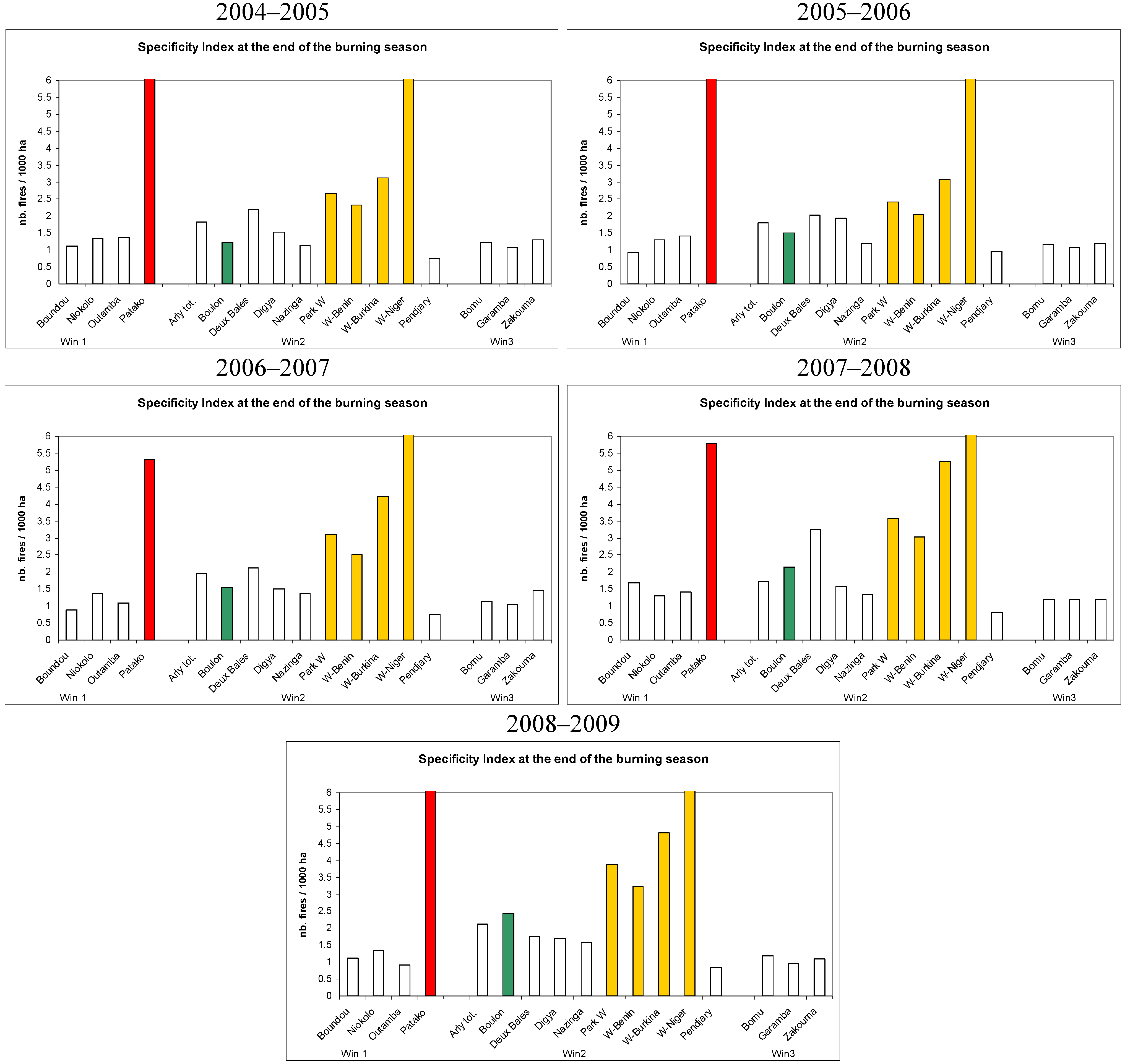 If, instead, we consider the ratio between the fire density inside and in the 25 km buffer zone (Specificity Index), the situation for the SUN PAs appears quite different (Figure 5). They are clearly among the PAs for which there is a high contrast between the fire activity inside and outside the PA. The extreme situation being observed for the Patako classified forest and for the ParkW-Niger, with a Specificity Index always above 5, which means that the fire activity is 5 times higher in these PAs than in their surroundings. In fact, the average fire density in the buffer zones of Patako and of ParkW-Niger over the five year period has been extremely low: 0.2 and 0.1 for Patako and ParkW-Niger respectively.