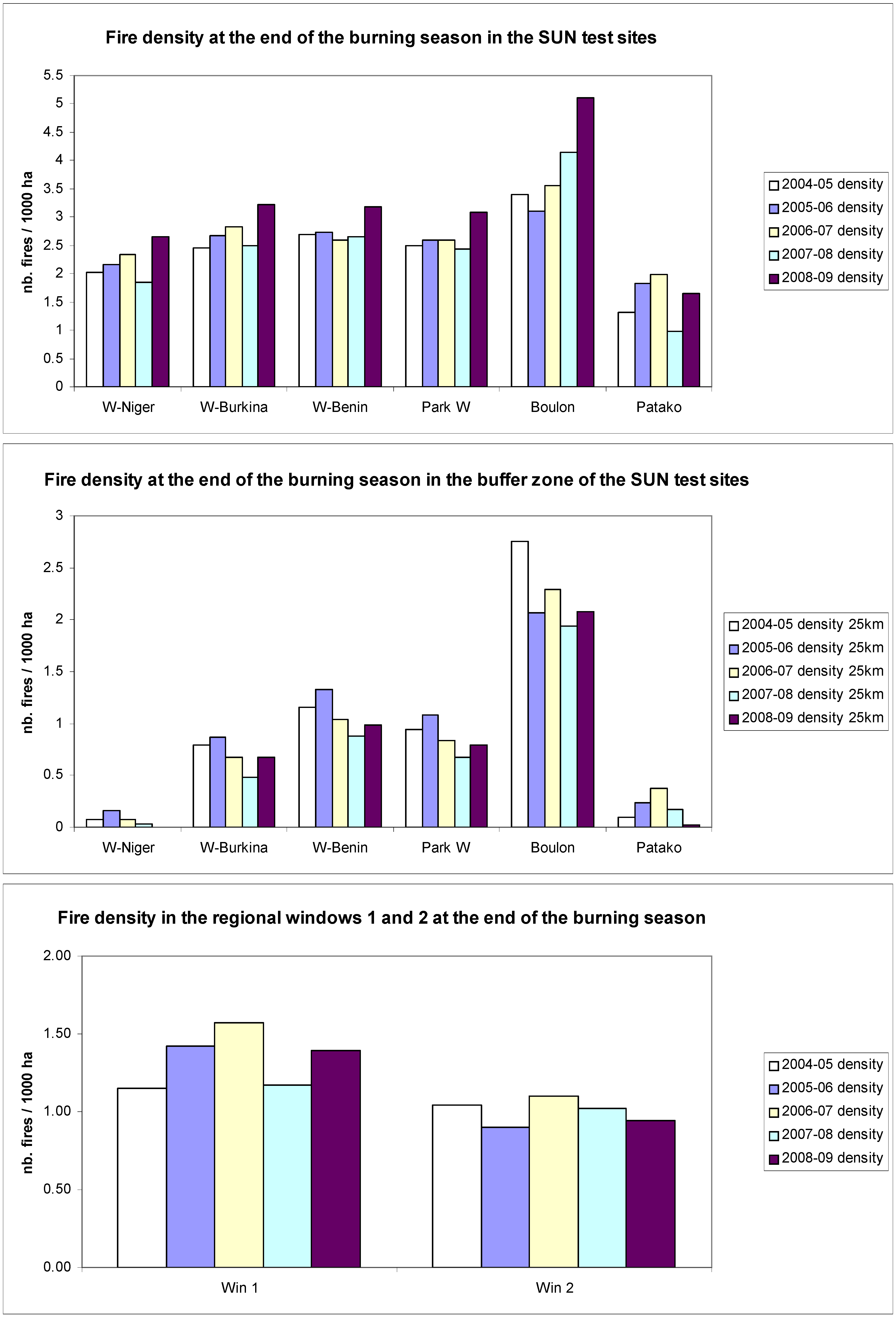In addition to the three variables used to characterise the temporal patterns of fire activity, two other variables have been defined for assessing the overall level of burning activity. First, the number of fire pixels per 1,000 ha detected over a given period of time; called fire density (fd) in the text, it allows comparisons between PAs. The second variable is the ratio between the fire density observed inside the PA and the one observed in a 25 km buffer zone around the area. Called Specificity Index (fsi) in the text, this ratio helps assessing how specific is a PA in terms of land cover conditions, compared to its surrounding. In fact, the fire density in the sudanian and guineo-sudanian regions is largely driven by the quantity and the spatial distribution of the fuel available for burning, essentially the grass layer. The quantity of grass biomass is much higher in the natural savannas or woodlands found in the PAs than in the surrounding area where croplands and pastures are the dominant land cover types. Moreover, numerous fire breaks prevent the development of fire events in this peripheral domain. The patterns of fire activity have been analysed for the four SUN test sites and have been compared to the fire dynamics observed in other 11 protected areas and in three large regional windows from West and Central Africa.