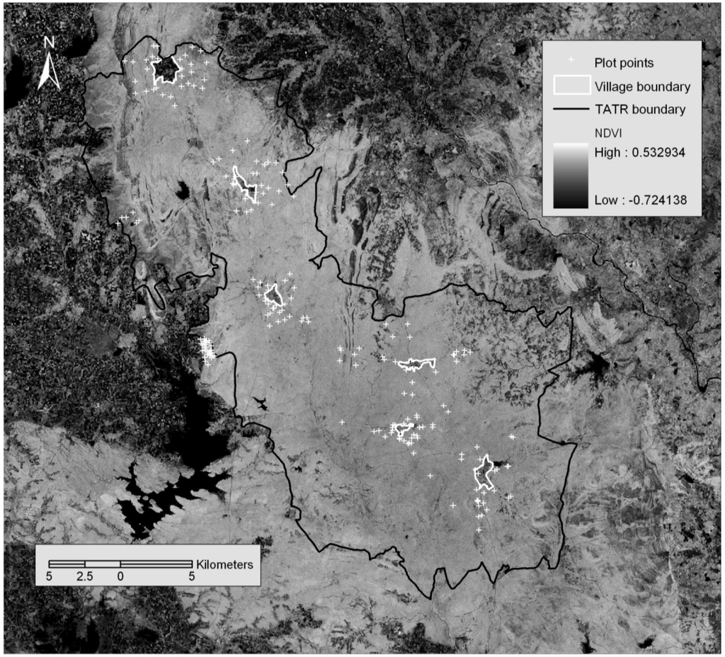 Between 2003 and 2005, a total of 240 circular plots were distributed across the TATR to sample plant biodiversity distributions, taking care to ensure that we sampled plant biodiversity at a range of distances from the settlements within and outside the protected area. Such a sampling strategy thus enables us to sample the variation in biodiversity within the park, from relatively undisturbed core areas to degraded areas adjacent to the park outer boundary. Since some of the plots were located outside the landscape covered by the IKONOS images, these were removed from analysis, leaving a total of 211 field plots that were used for this study. Figure 1 shows the distribution of the 211 field plots with respect to the TATR boundary and the six villages then located within the park. In order to depict the distribution of plots with respect to forest cover, the plots are overlaid on a map of the Normalized Difference Vegetation Index (NDVI) of the Landsat image. This index, whose values range from −1 to +1, is derived from the red and infrared bands, and is an indicator of vegetation density (see [26]).