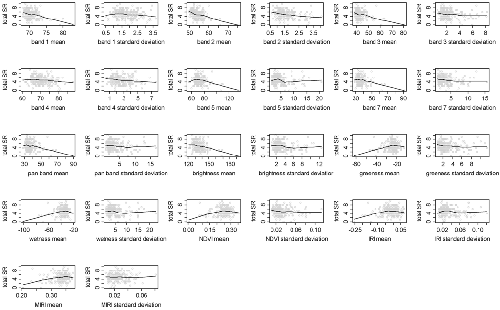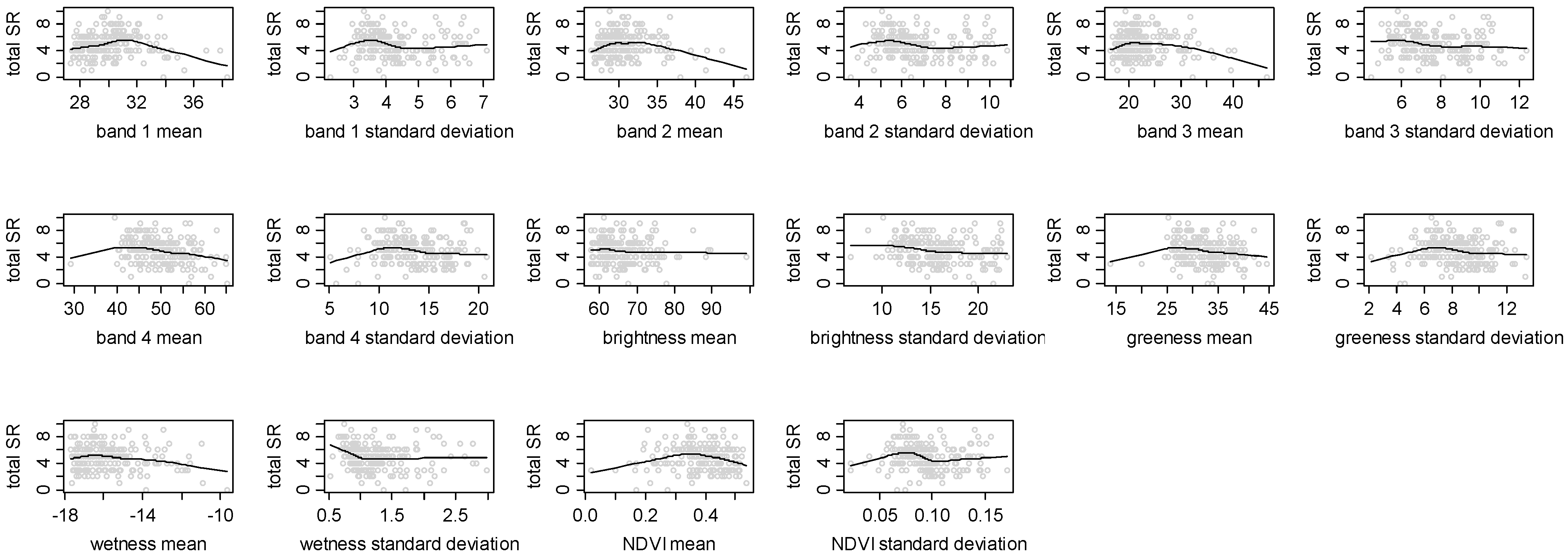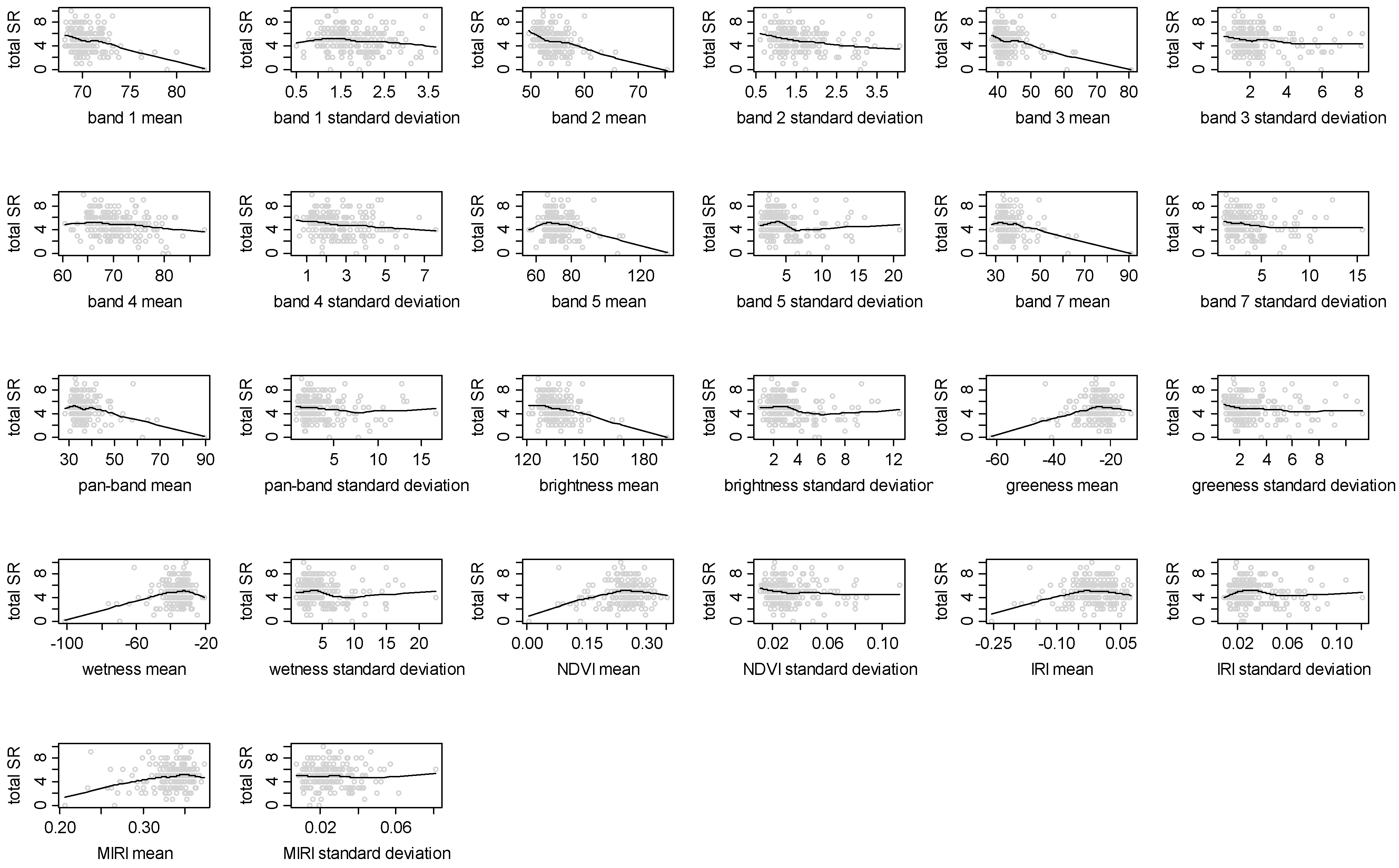 Scatterplots of total species richness (SR) vs. Landsat ETM+ spectral variables. Fitted curves represent LOWESS based smoothing.