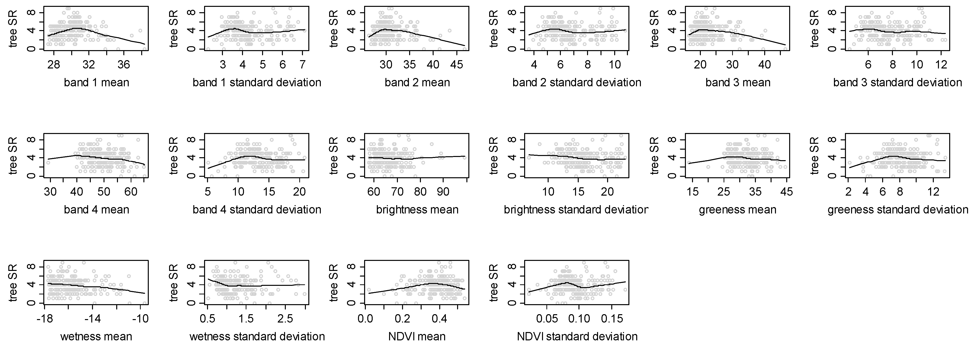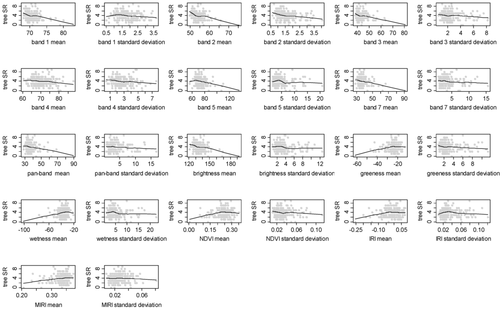 Scatterplots of tree species richness (SR) vs. Landsat ETM+ spectral variables. Fitted curves represent LOWESS based smoothing.