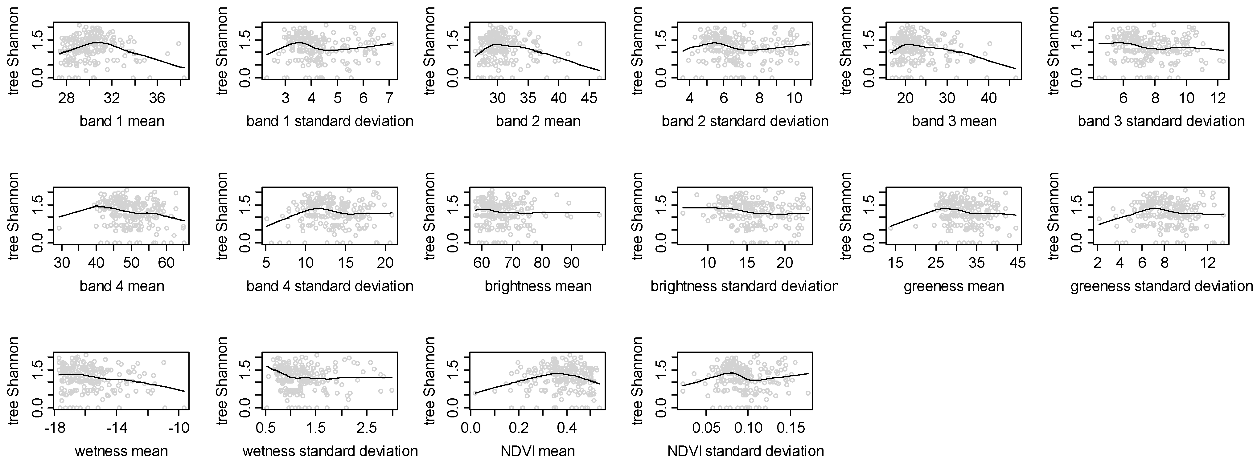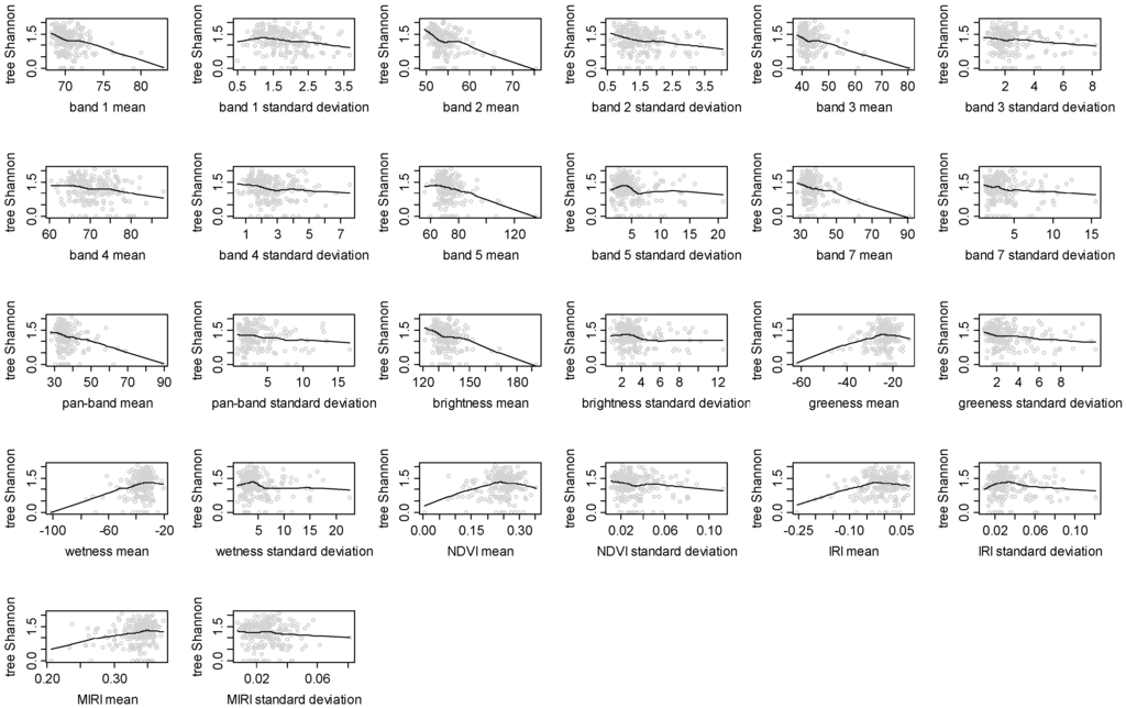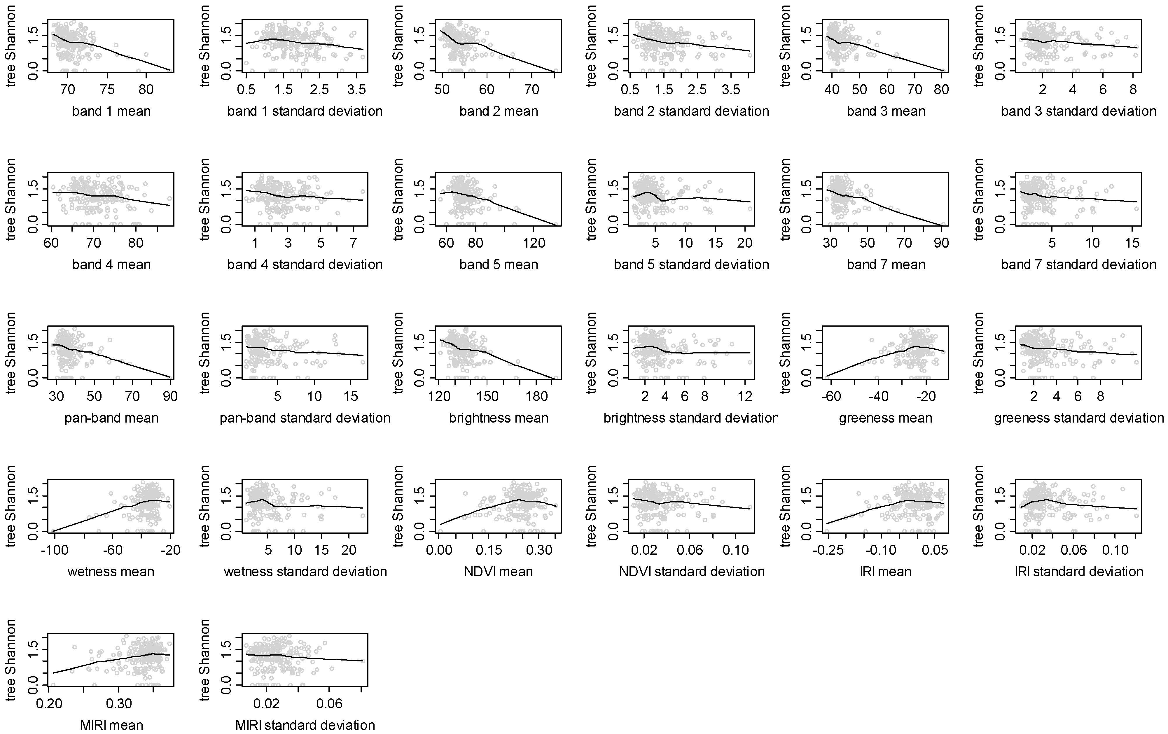 Scatterplots of tree Shannon diversity vs. Landsat ETM+ spectral variables Fitted curves represent LOWESS based smoothing.