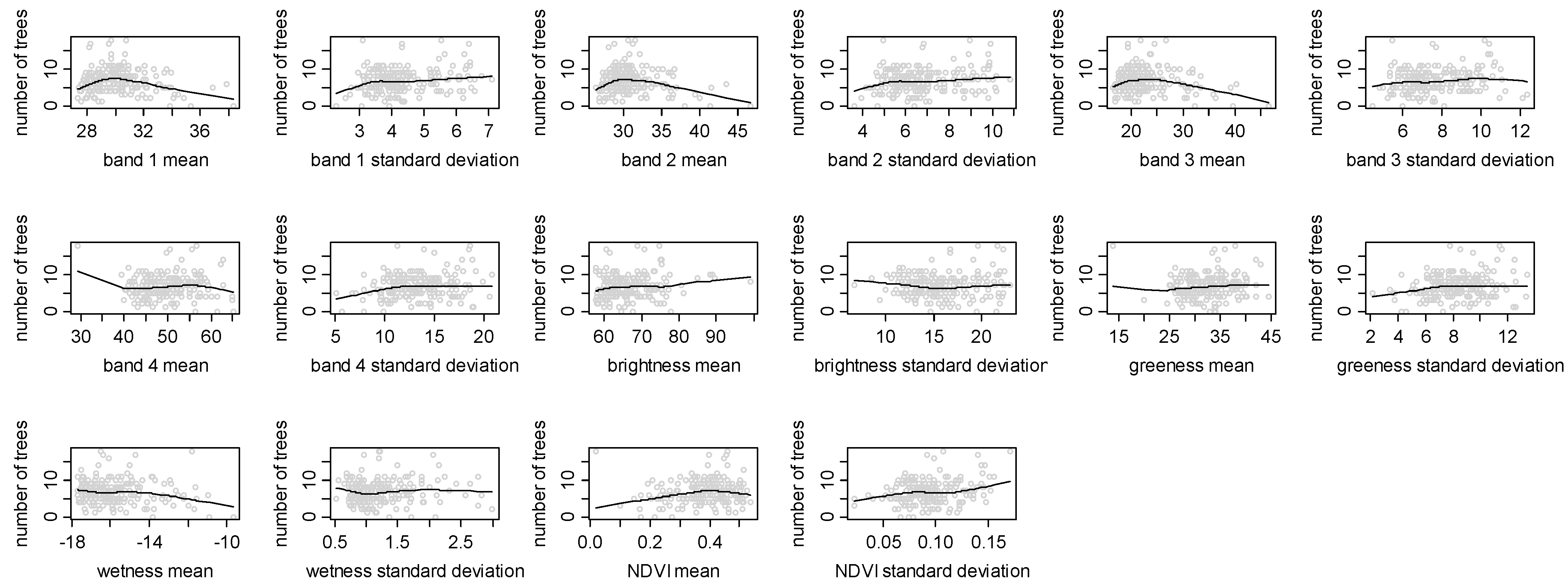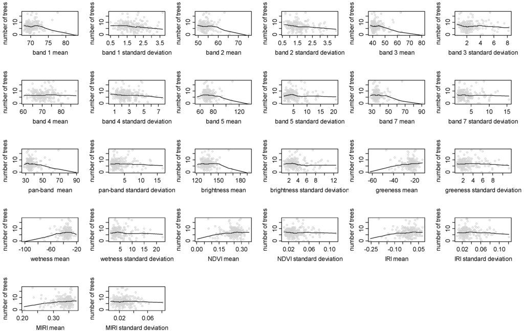 Scatterplots of the number of trees vs. Landsat ETM+ spectral variables Fitted curves represent LOWESS based smoothing.