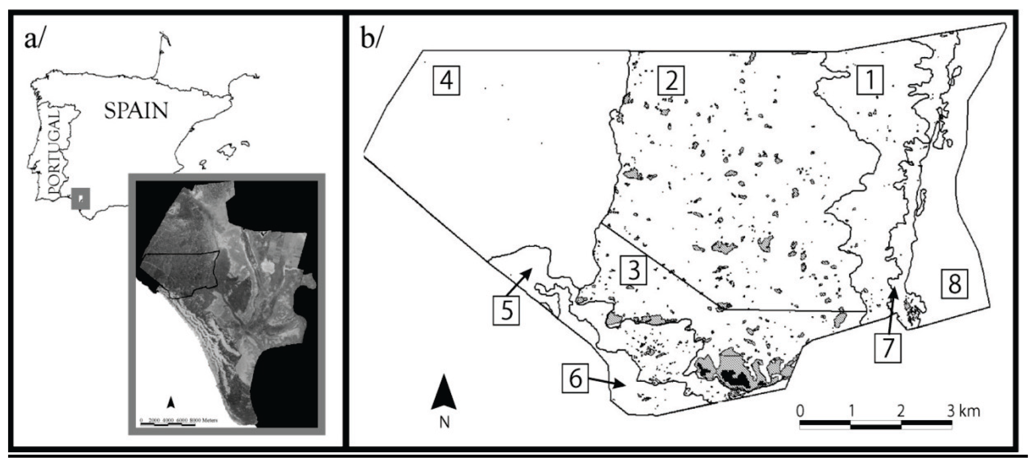 (a) Location of Doñana National Park in southwestern Spain. Solid black line delimits Doñana Biological Reserve (study area). (b) Study area with the Ecosections as defined in this work: 1. Low stabilized sands (exorheic zone) [LOW SANDS]; 2. Northern part of wet high stabilized sands (endorheic zone) [NORTHERN SANDS]; 3. Southern part of wet high stabilized sands (endorheic zone) [SOUTHERN SANDS]; 4. Dry high stabilized sands (arheic zone) [DRY SANDS]; 5. Semi-stabilized dunes [SEMI-STABILIZED DUNES]; 6. Mobile dunes [DUNES]; 7. Ecotone marshes-stabilized sands [ECOTONE MARSHES-SANDS]; 8. Marshes (excluded from the study). Solid black area represents areas of permanent water, which were excluded from this study.