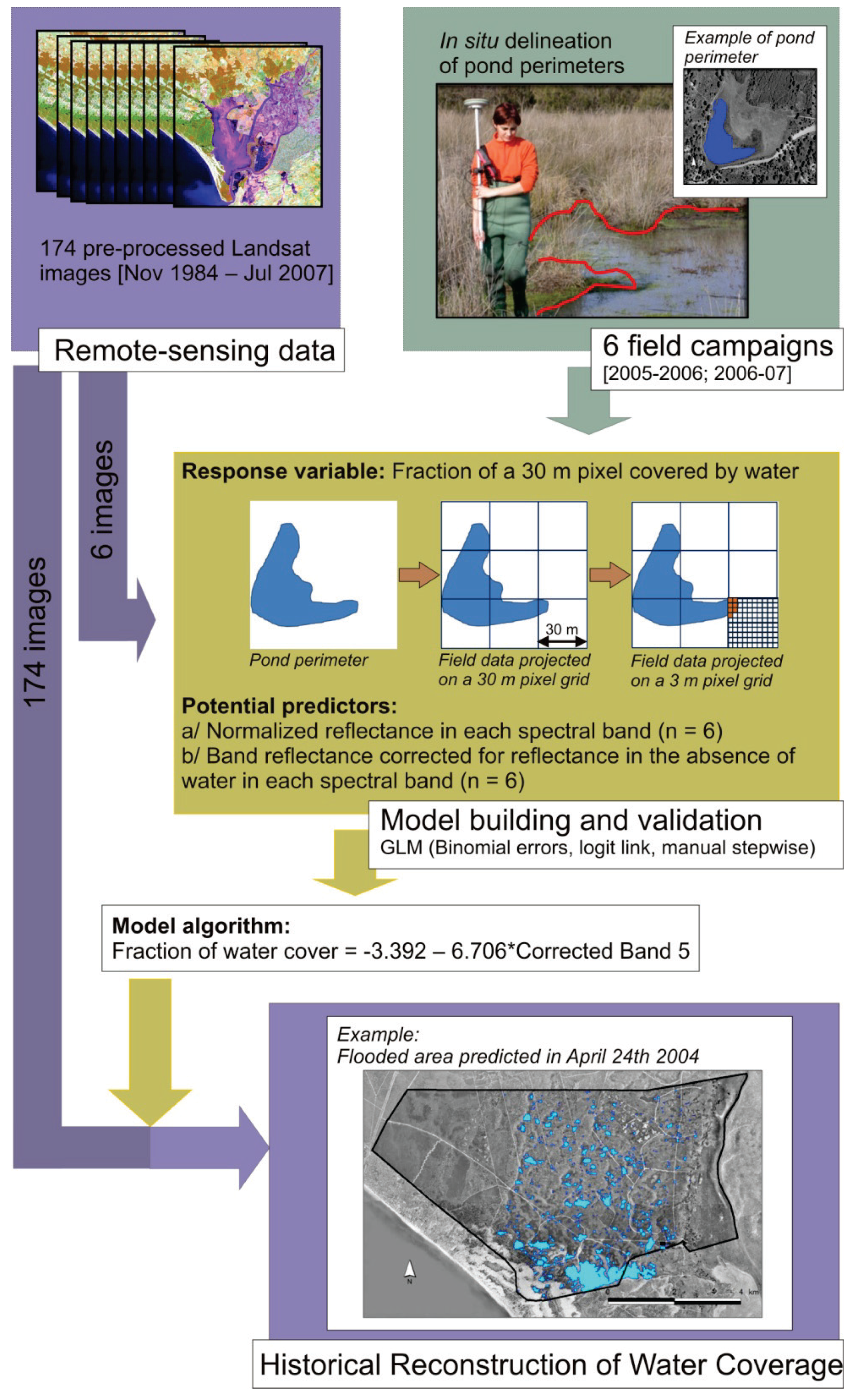 The final GLM model, fitted to data from all ground-truthing dates, was applied to the time-series of Landsat images to obtain a map of the fraction of water in each potentially flooded pixel on each date. We modified model predictions by applying the zero-threshold value yielded by the validation procedure. Pixels in permanent ponds that contained water in August 2006 (136 pixels) were excluded from further pixel-based analyses, and analogously, those permanent ponds were removed from further pond-based analyses (i.e., average hydroperiod, pond annual hydroperiod or pond density).