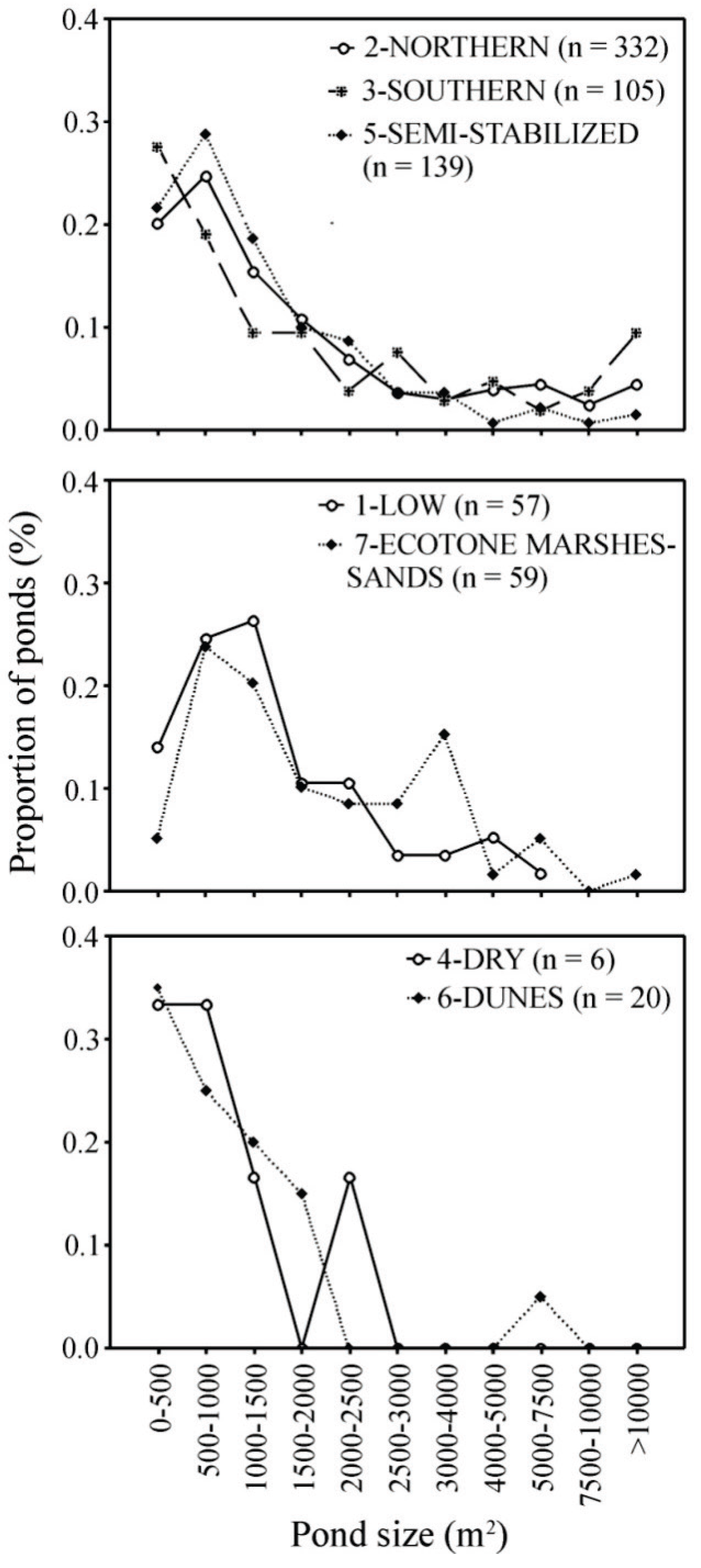The maximum flooded area occurred in the ecosections NORTHERN and SOUTHERN SANDS, whereas the maximum temporary pond density occurred in the SEMI-STABILIZED DUNES. The minimum flooded area and temporary pond density occurred in the DRY SANDS. Small temporary ponds (<1,500 m2) were the most frequent size class in all ecosections (Figure 4).