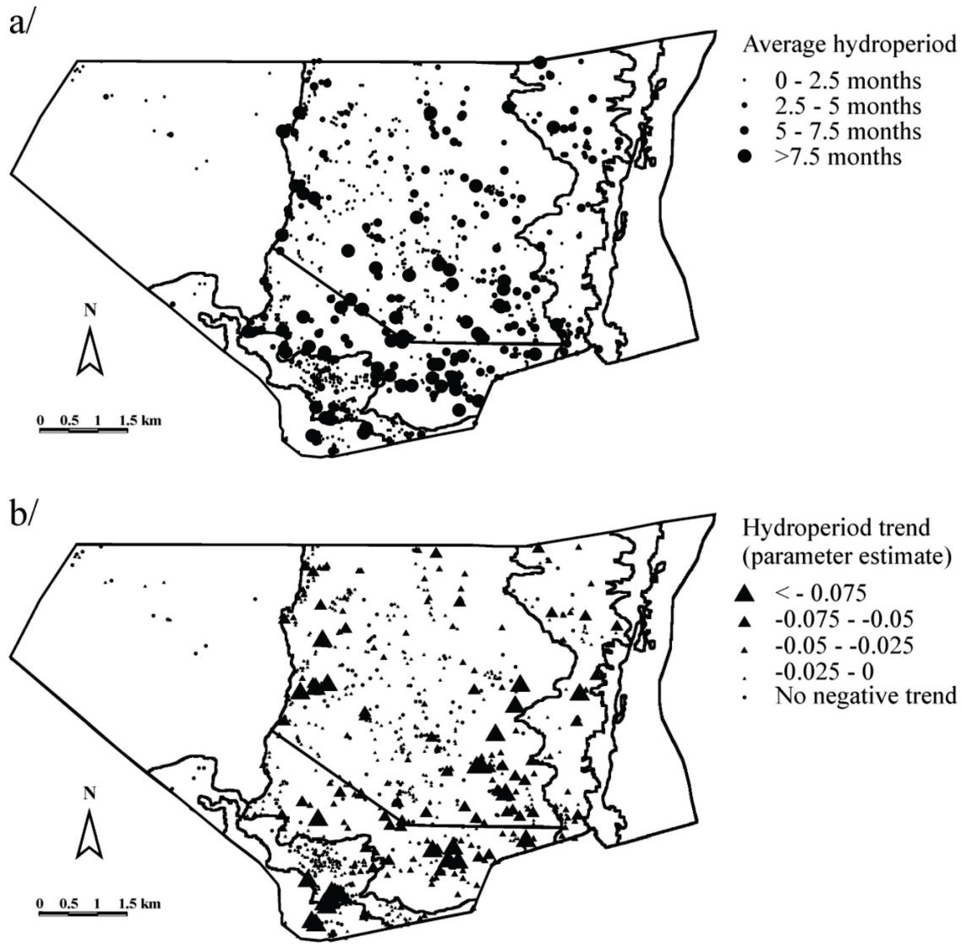 (a) Cartography of average hydroperiod (frequency of water occurrence) over the entire study period. (b) Cartography of the trend in annual hydroperiod for each temporary pond over the entire study period. Hydroperiod trend is estimated as the slope of the regression between annual hydroperiod and year (months/year).