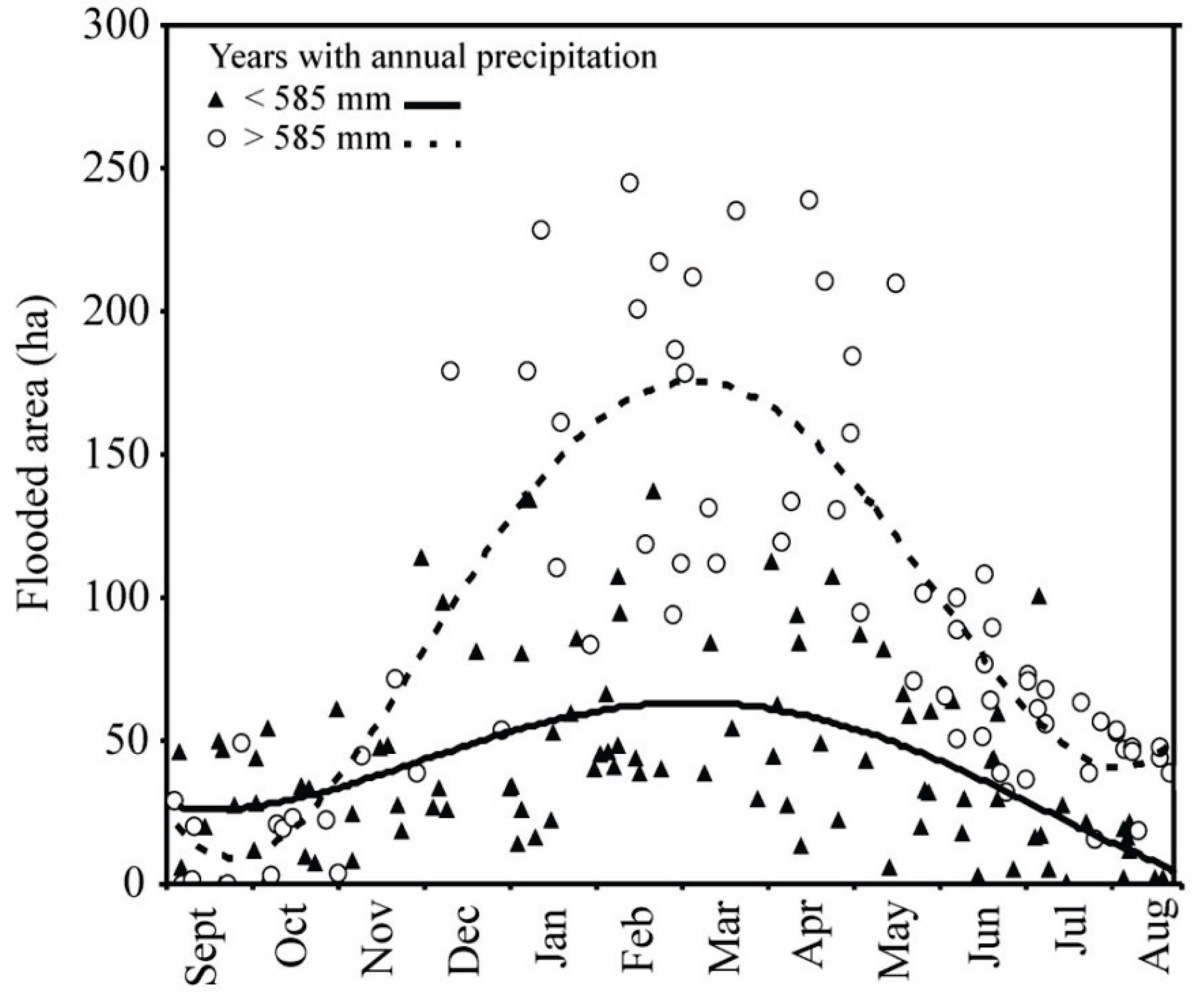 Flooded area presented a large intra-annual variability, mainly in years with annual rainfall higher than the long-term average (Figure 6). As a rule, flooded surface was low during the dry season (June–August) and continued low in September-November until the first autumn-winter rains (Figure 6). Values of flooded surface at the beginning of autumn were similar between rainy and dry years; however, flooded surface in summer months was notably higher in rainy years. Flooded surface tended to increase from September to December and tended to decrease from April-May up to August. We observed a notably increase in flooded surface, especially in rainy years, at the end of autumn months (December). Similarly, we observed a marked decrease in flooded surface between April–May and June–July in rainy years while such decrease was more gradual in dry years.