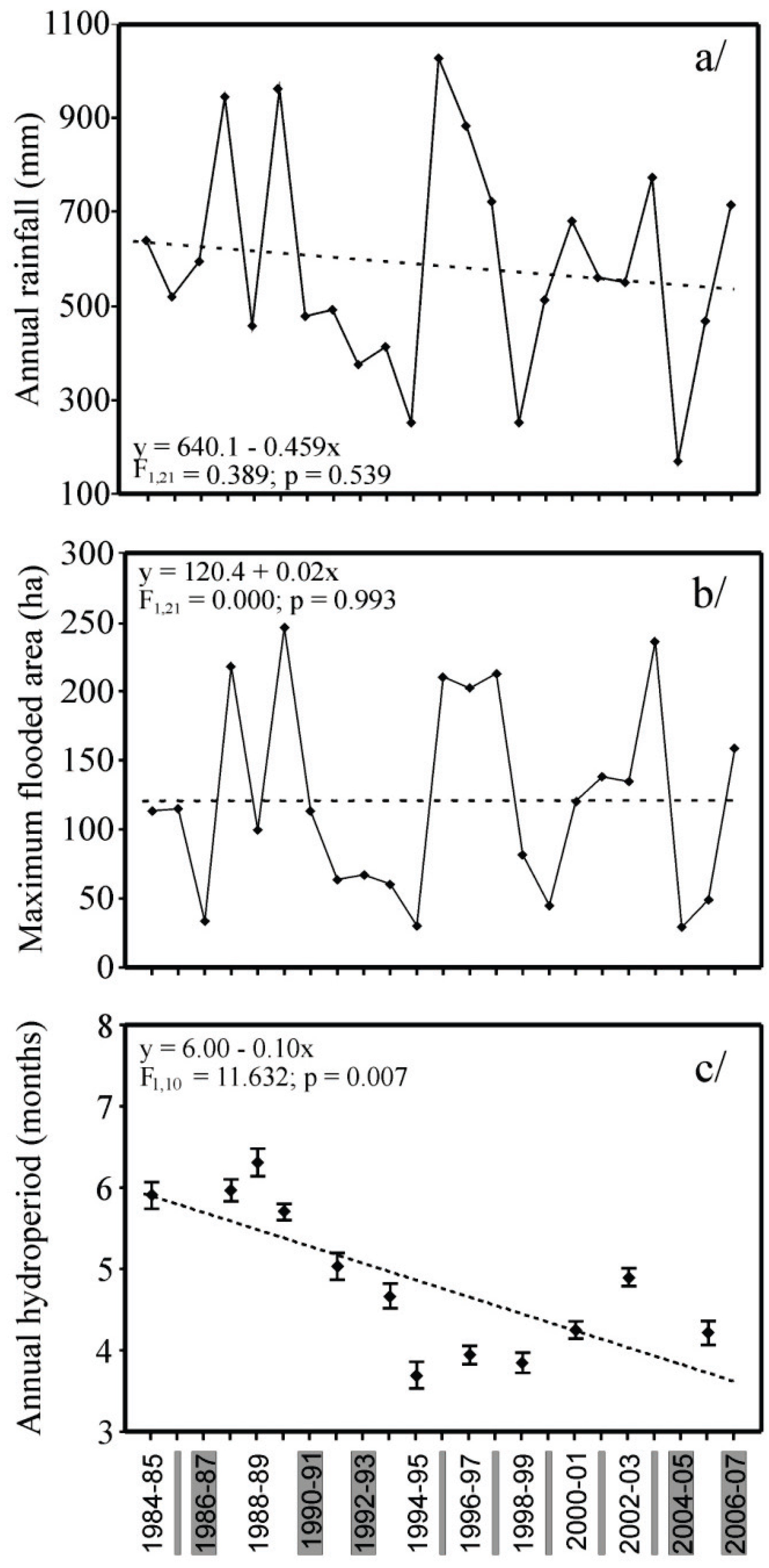 Inter-annual trends in (a) annual rainfall, (b) maximum flooded area and (c) annual hydroperiod (mean and standard error) for the entire study area. Linear fit and adjusted equation is also shown. Years in grey indicate that no representative or enough images were available to compute annual hydroperiod that year.