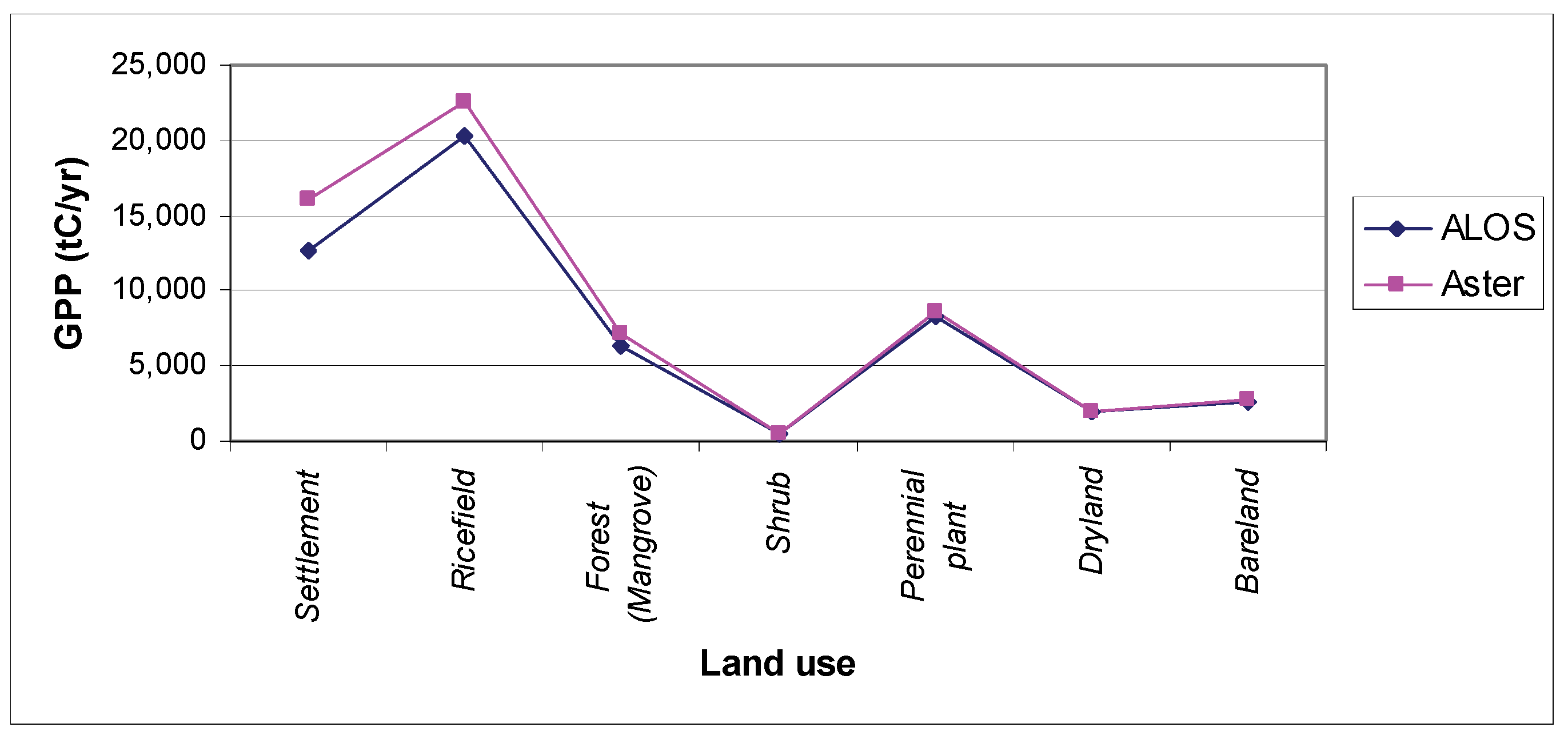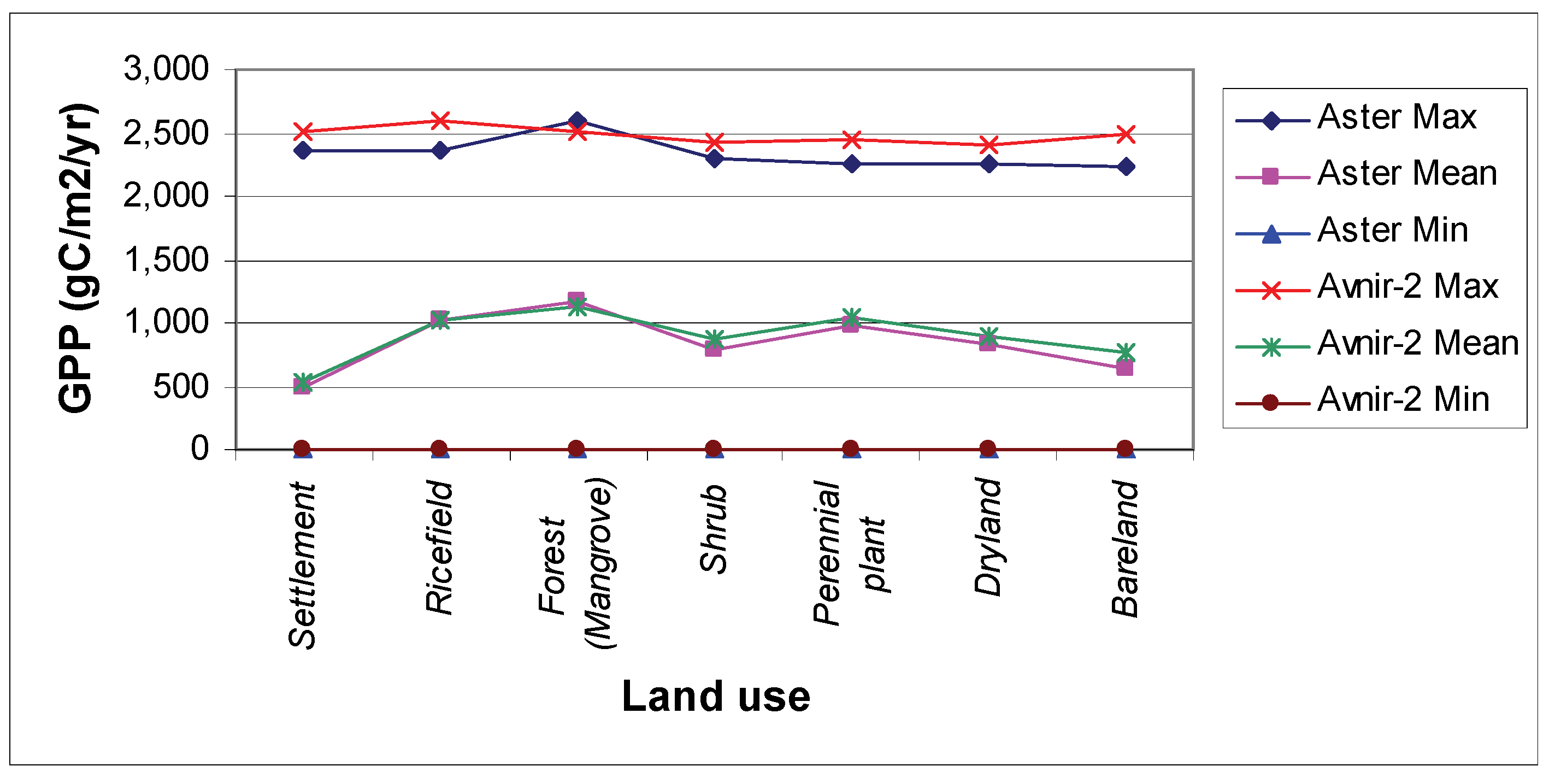 | GPP value (gC m−2 yr−1) | ALOS/AVNIR-2 | Aster | ||