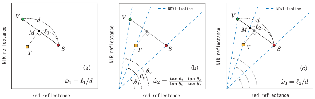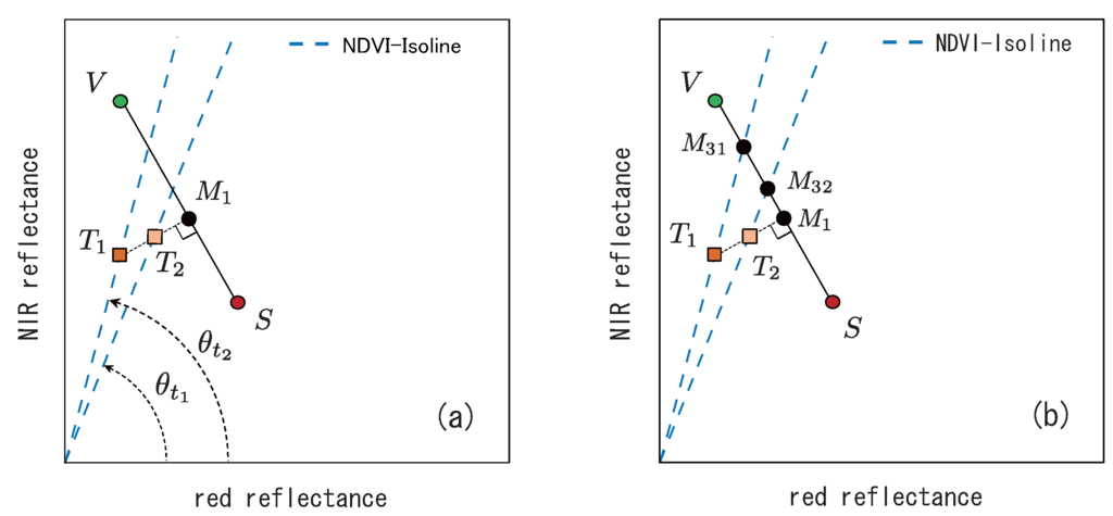 This algorithm is illustrated in Figure 1(c) for the case of NDVI. In the figure, the modeled spectrum (denoted by the point M) is determined by the intersection of the model subspace and the single dimension spanned by the endmember spectra (V for the vegetation and S for the non-vegetation) and the VI-isoline, which passes through the target spectrum (the point T in the figure). The value of FVC () is determined as the ratio of the distance () between S and M to the distance (d) between S and V.