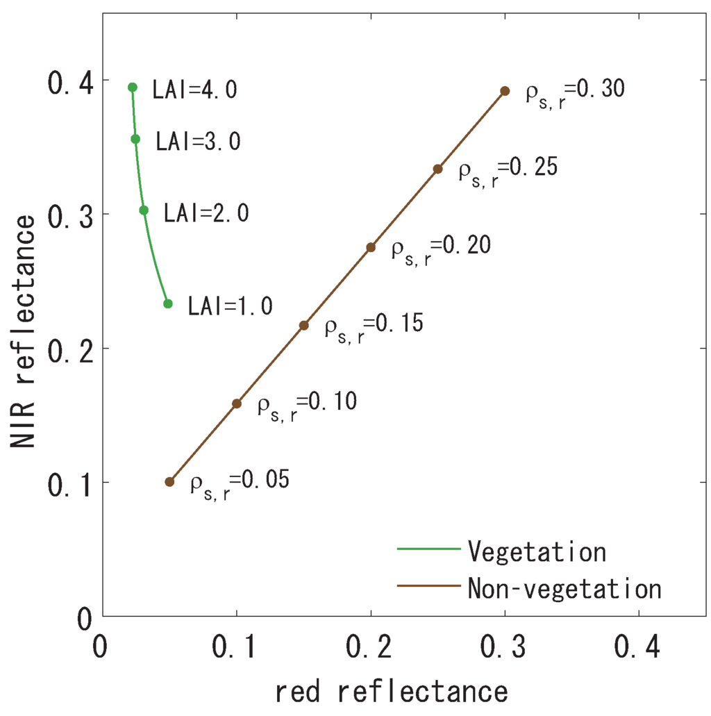 Plot of endmember spectra in red-NIR reflectance space. Sequences of vegetation and non-vegetation endmember are represented as a green and a brown line, respectively. Values of LAI and red reflectance of non-vegetation surface () are indicated in the lines.