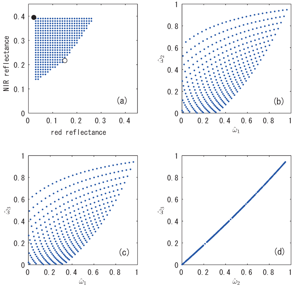 Since the mappings and are not one-to-one, the relationships between and the others ( and ) are not uniquely determined. This implies some degree of uncertainty in the relationships between the two algorithms. This fact is clearly illustrated in Figure 2(a). The figure shows the geometrical relationship between algorithms-1 and -2 in the red-NIR reflectance space. In the figure, the spectra of the two endmembers are represented by the points denoted by V and S. The two target spectra represented by and produce an identical FVC value by algorithm-1 because the nearest point in the model subspace () is the same for both and . However, and are not the same, which means that the values of for and are different. Similarly, the relationship between and is illustrated in Figure 2(b). Although the two target spectra and yield the same FVC value by algorithm-1, the FVCs retrieved by algorithm-3 are different (denoted by and ).