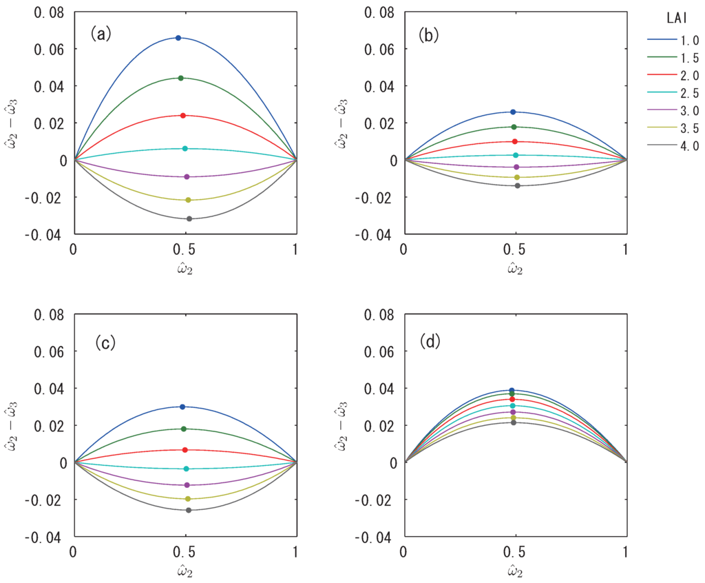 Finally, the plots of and are shown in Figures 9(a–d) and Figures 9(e–h), respectively. In those figures, LAI (the x-axis) represents the vegetation endmember spectrum, and the soil red reflectance (the y-axis) represents the non-vegetation endmember. These figures clearly showed that and the maximum difference (in the absolute sense) depended on the combination of the endmember spectra to some extent. Interestingly, both and depended more heavily on the choice of non-vegetation endmember spectrum than on the vegetation endmember spectrum, which implies the presence of soil influence on both variables.