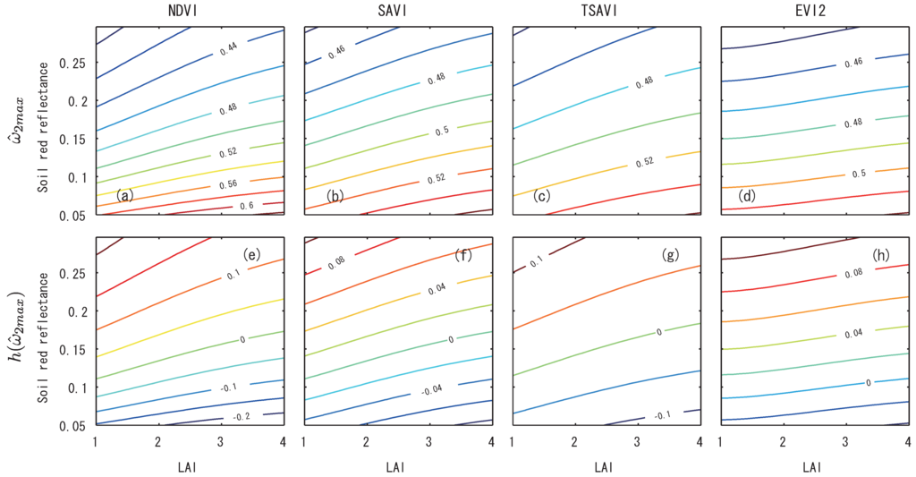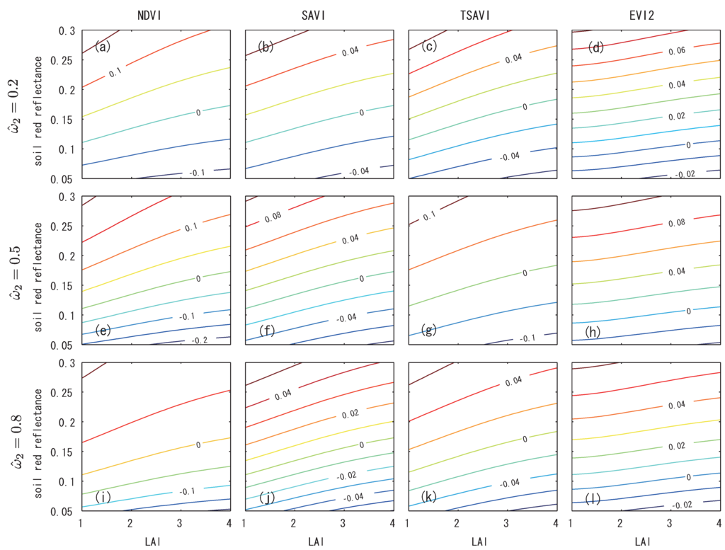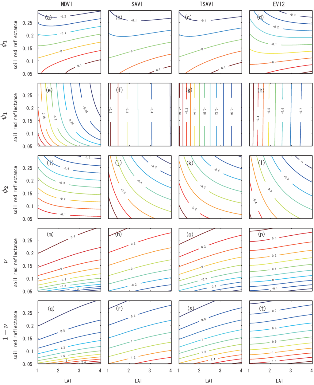 Figures 8(a–t) summarize the contour plots of , , , ν, and as a function of vegetation endmember spectrum (represented by LAI in the x-axis) and non-vegetation endmember spectrum (represented by soil reflectance of the red band in the y-axis) for the four VIs (NDVI, SAVI, TSAVI, and EVI2).