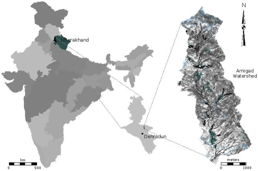 The study area, Arnigad watershed (30°22′N–30°27′N and 78°04′E–78°08′E) is a typical Lesser Himalayan watershed located to the northeast of Dehradun in the Indian state of Uttarakhand (Figure 1). The 13 km2 watershed is characterized by large elevation changes over short distances resulting in a steep mountainous terrain and an altitudinal range extending from 900 m to 2,200 m above sea level. The catchment is underlain by Pre-Cambrian to early Paleozoic sedimentary rocks mainly limestones and dolomites but also slates and shales along with recent and subrecent deposits [20]. The soils are shallow in depth with increasing presence of gravel, stones and boulders in the lower horizons [21].