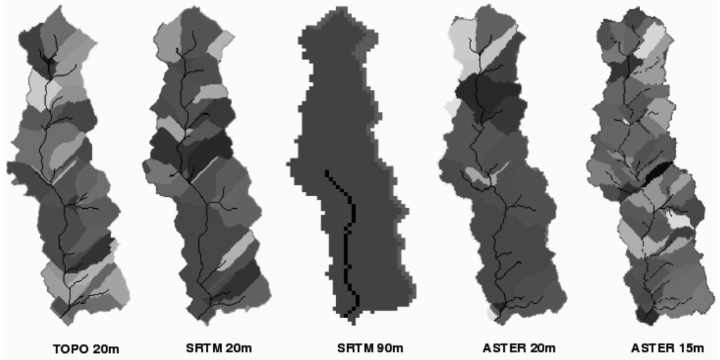 The total watershed area was the highest for the SRTM DEMs which also produced the lowest number of hillslopes and channels while the ASTER DEMs had the smallest watershed areas but the highest number of hillslopes and channels (Table 3; Figure 2). For the total watershed area, the differences between the original and interpolated resolution were not very high for both SRTM and ASTER DEMs but for the number of hillslopes and channels the resulting differences were quite significant. The hillslope profile and the channel segments were extracted keeping the threshold limit of cells flowing into a stream constant for all the 20-m resolution DEMs.
