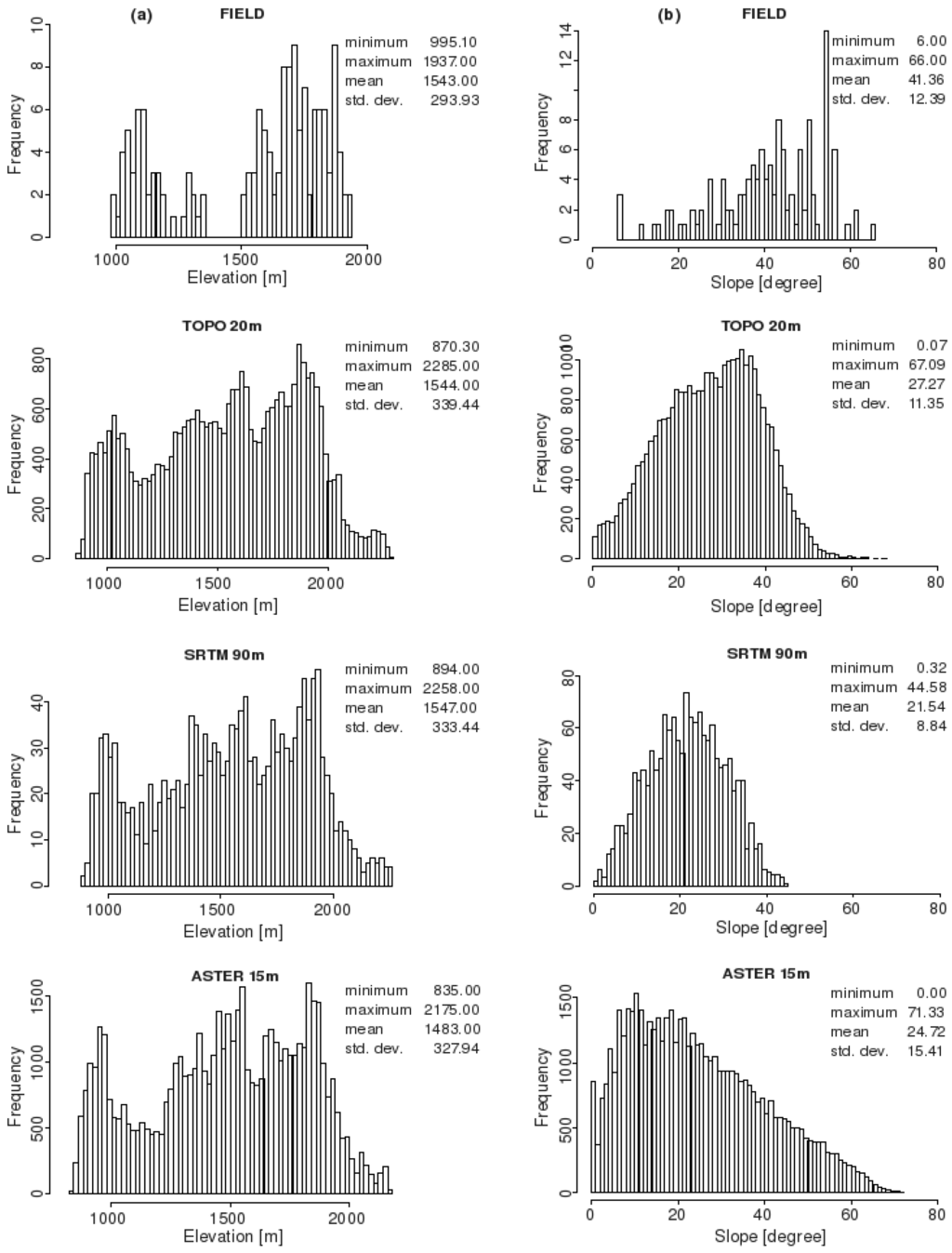 Frequency histograms and univariate statistics showing (a) field measured elevations and DEM derived elevations at original resolutions, and (b) field measured slopes and DEM derived slopes at original resolutions.