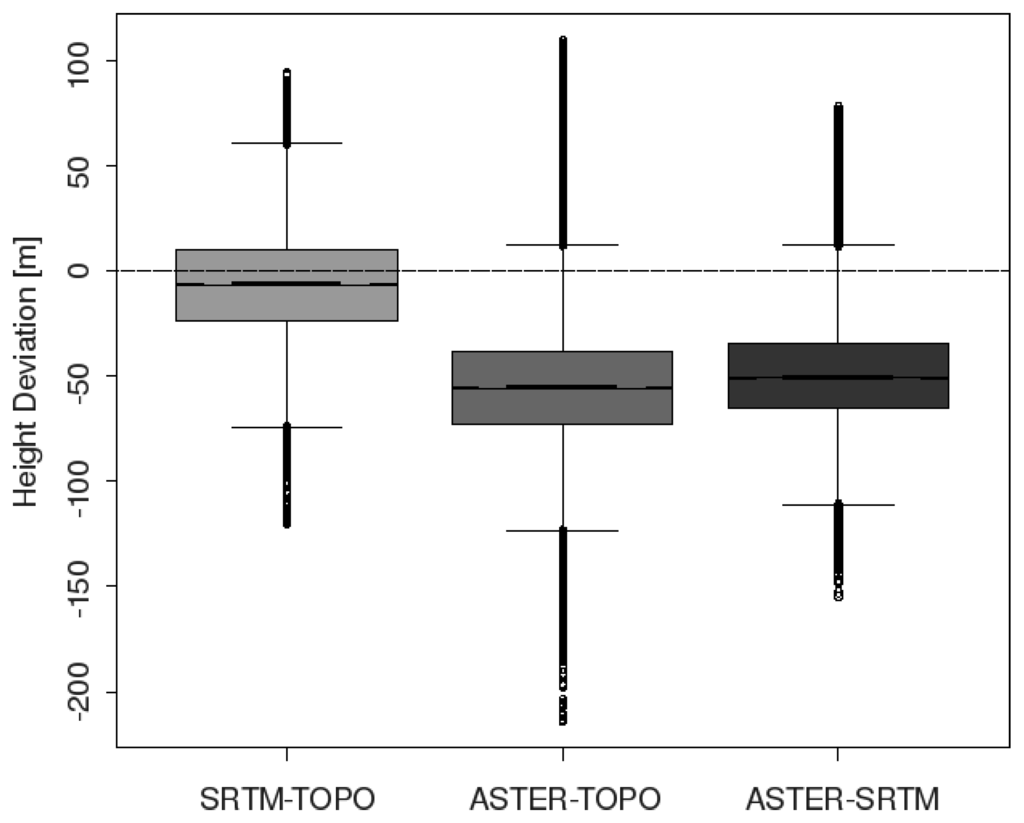 Elevation differences at 20-m spatial resolution between SRTM, ASTER and TOPO DEMs.