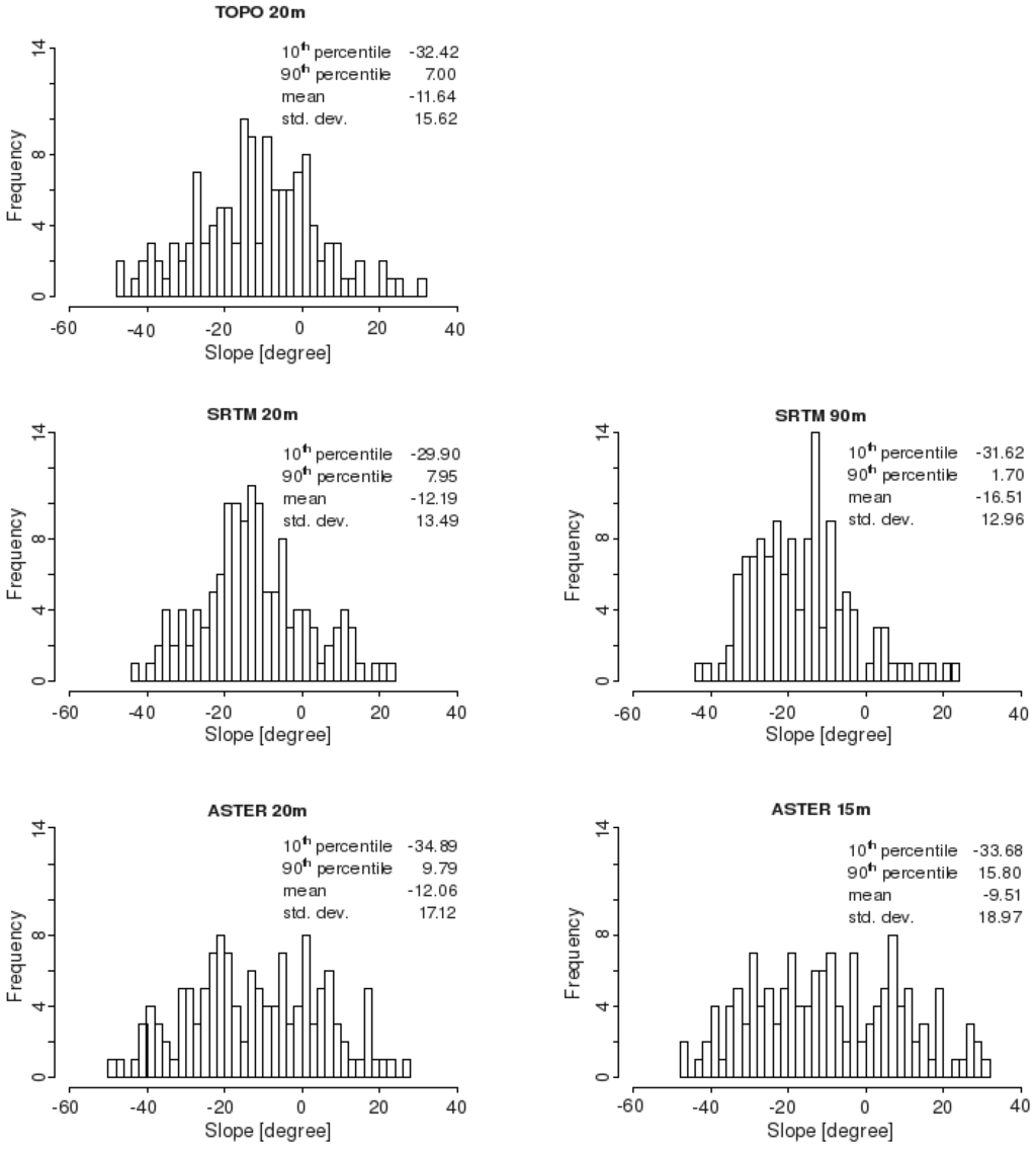 The histograms and descriptive statistics comparing the slopes derived from the three original DEMs and the measured slopes at 152 field areas are presented in Figure 3b. The mean slope is highest in case of TOPO 20m and lowest in SRTM 90m. The standard deviation from the mean and the slope range is higher for both the ASTER DEMs as compared to the other DEMs. The two ASTER DEMs are also positively skewed while both the SRTM and the TOPO DEMs are negatively skewed (Figure 3b).