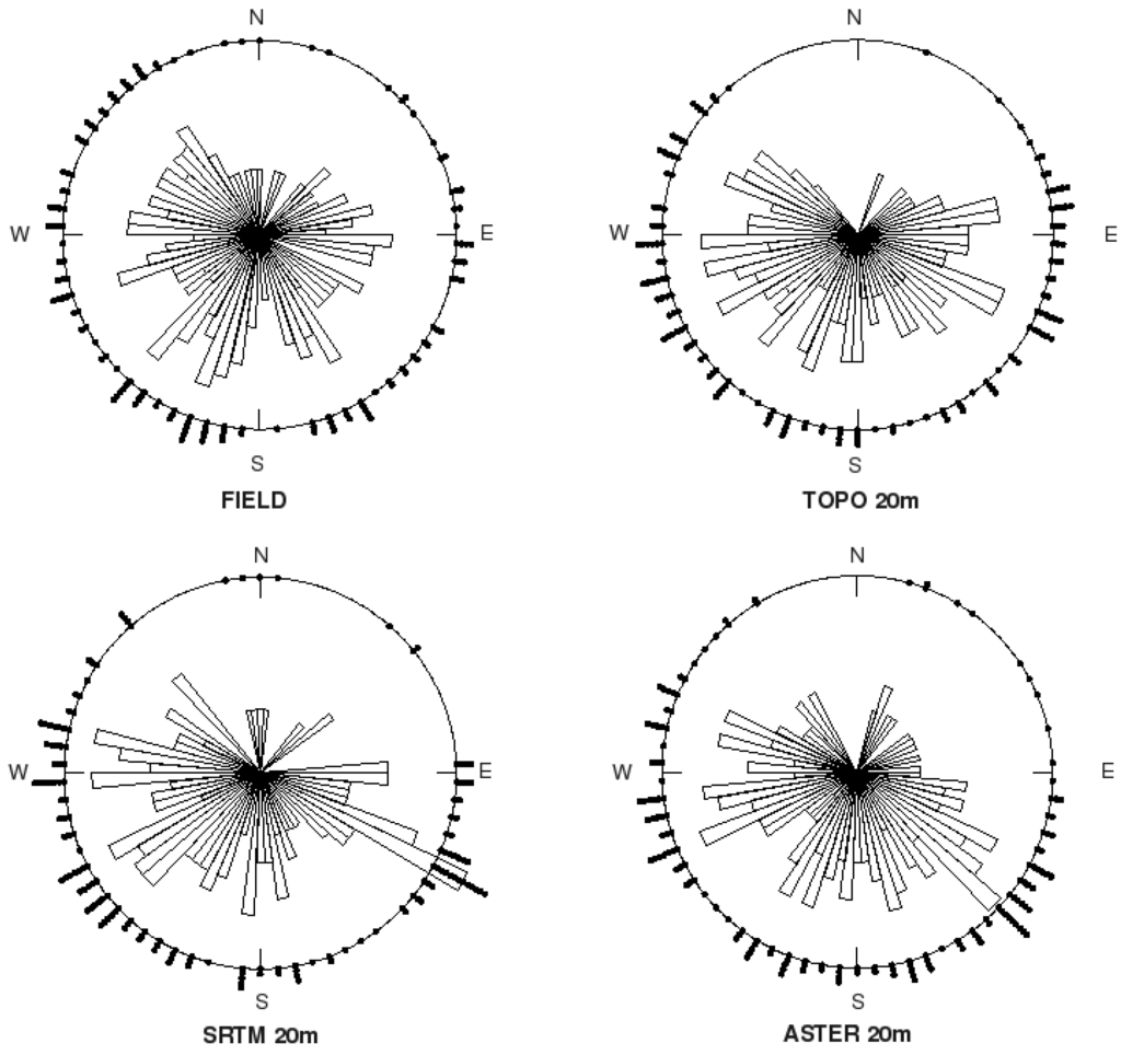 Rose diagrams showing the distribution of aspects in the field and as derived from 20-m resolution DEMs.