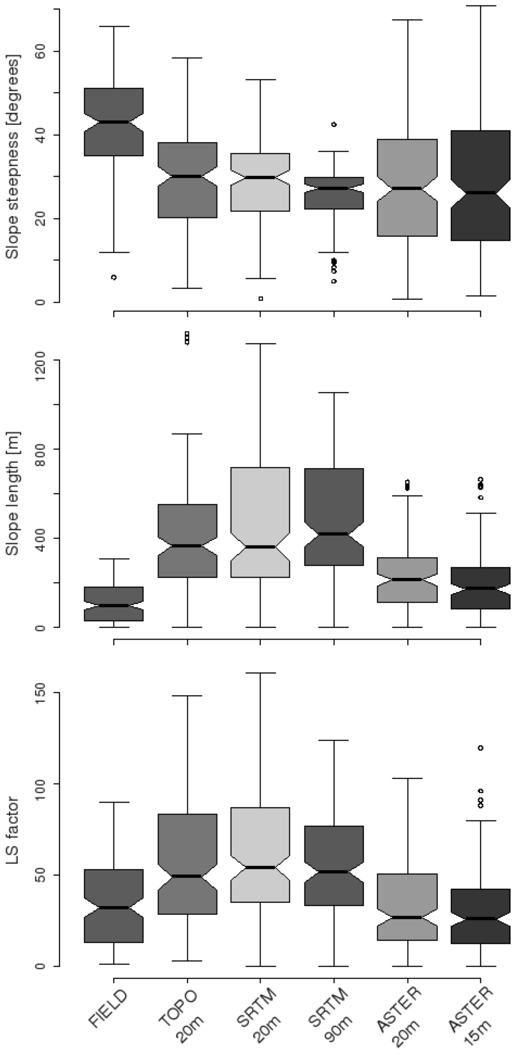 In contrast, significantly similar underestimation of slope steepness values was observed for all the DEMs. The RUSLE LS factor values obtained using these DEM generated parameters appear to be more sensitive to slope lengths than to the slope steepness, which is in contrast to the observations made by [34]. This sensitivity may be attributed to almost identical mean slope steepness of all the DEMs. The LS factor values obtained from the ASTER DEMs, although closer to the field measured LS factor values in magnitude, may not be considered to be accurate representation of the field topography. This result appears to be a random improvement rather than being a higher field relevance of ASTER DEMs because the slope lengths produced by the ASTER DEMs, though significantly lower than the other DEMs, are not based on a realistic surface topography but may be the result of artifacts in the high resolution DEMs.