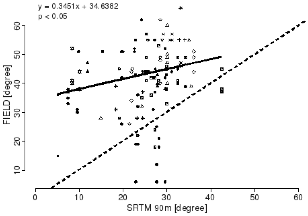 Correlation between slope data from SRTM 90m DEM and field measurements. Different symbols denote data collected along different transects (continuous thick line is the regression line).