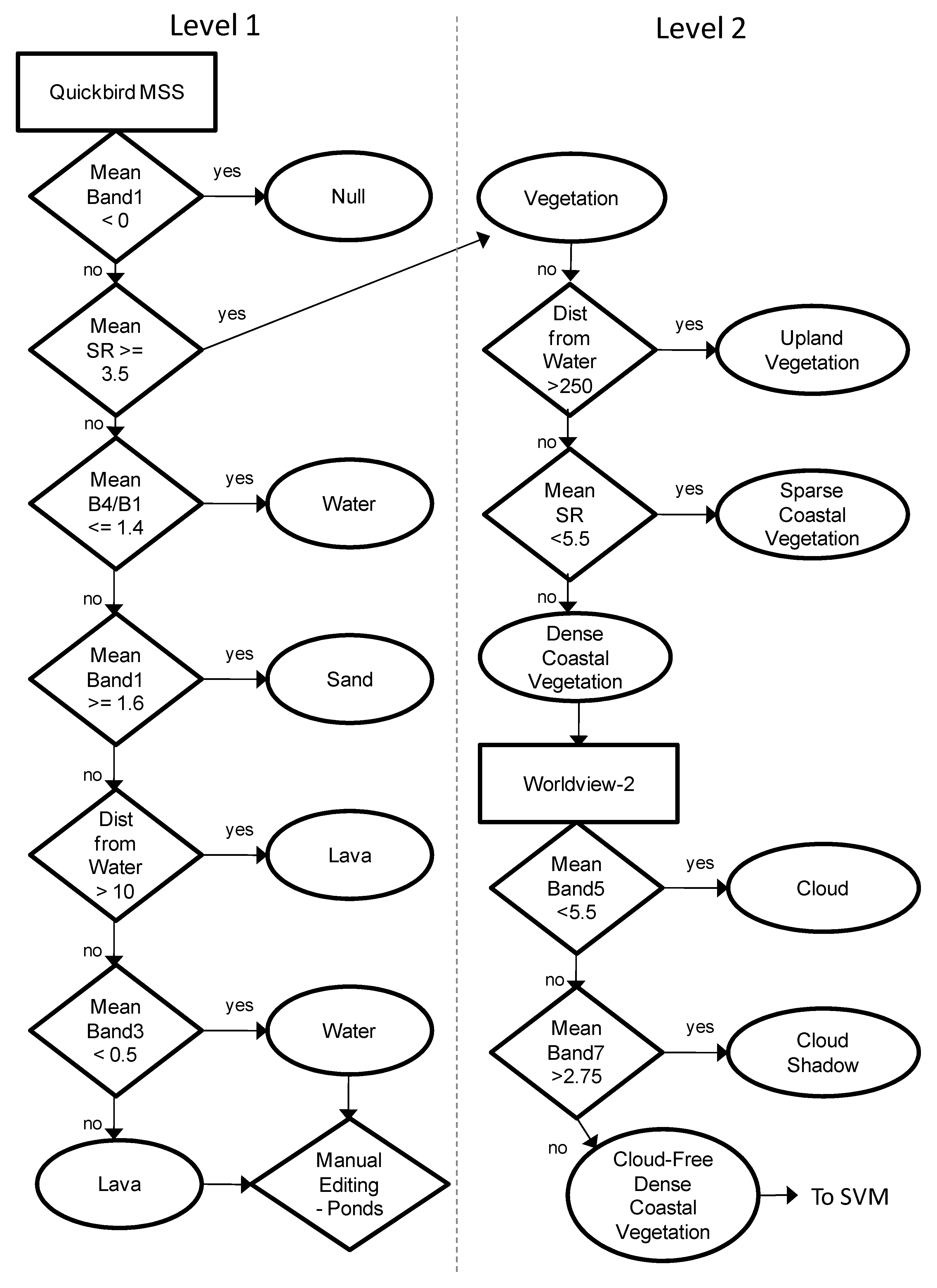 30]. For remote sensing, SVM is a useful tool for multispectral and hyperspectral classifications in which spectral separability is less than perfect. The mathematical formulation of SVM is described by Vapnik [