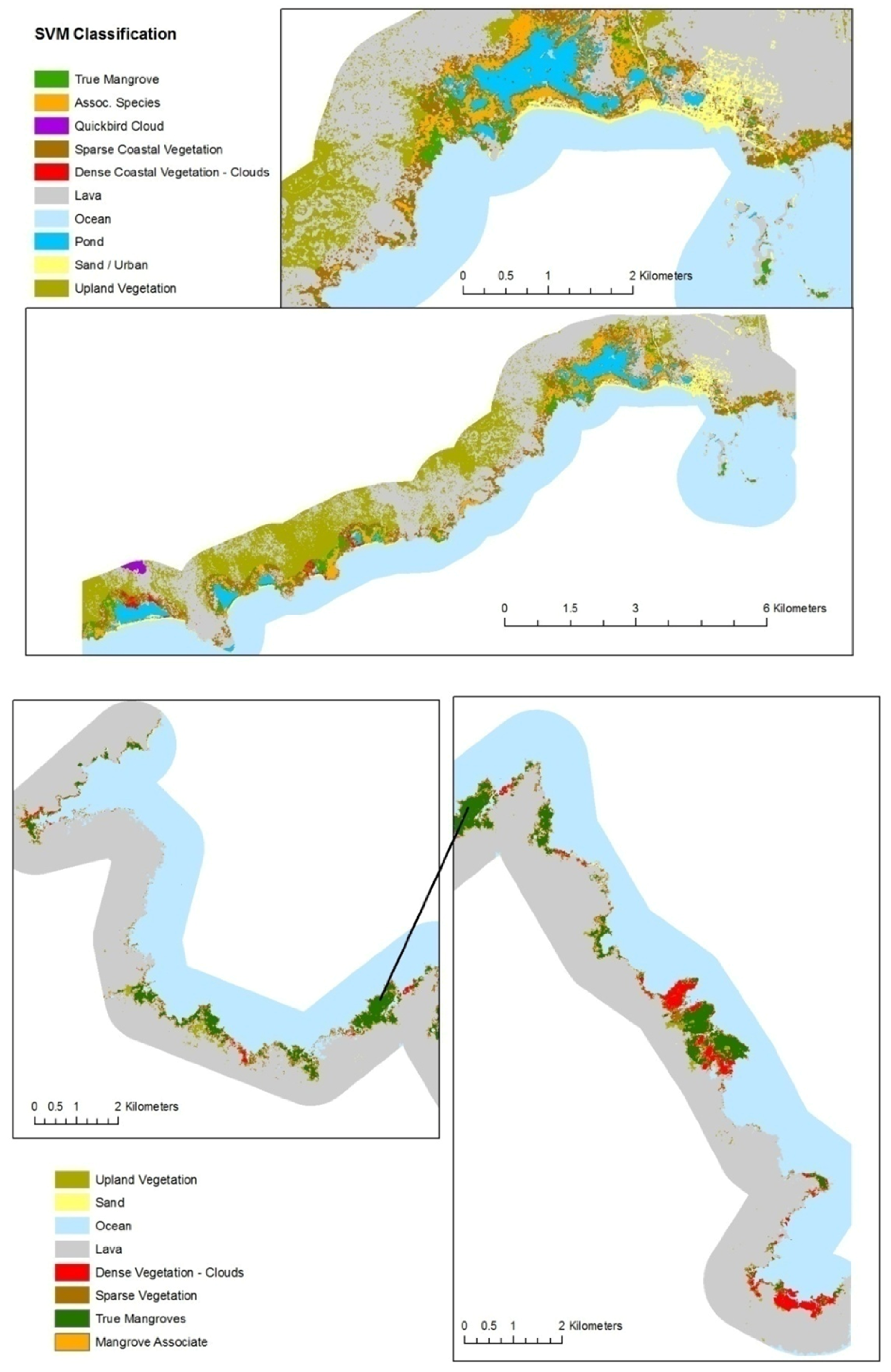 36] applied SVM to an OBIA with better results than standard fuzzy logic classification. Only a single study has applied SVM for analysis of mangroves. Huang