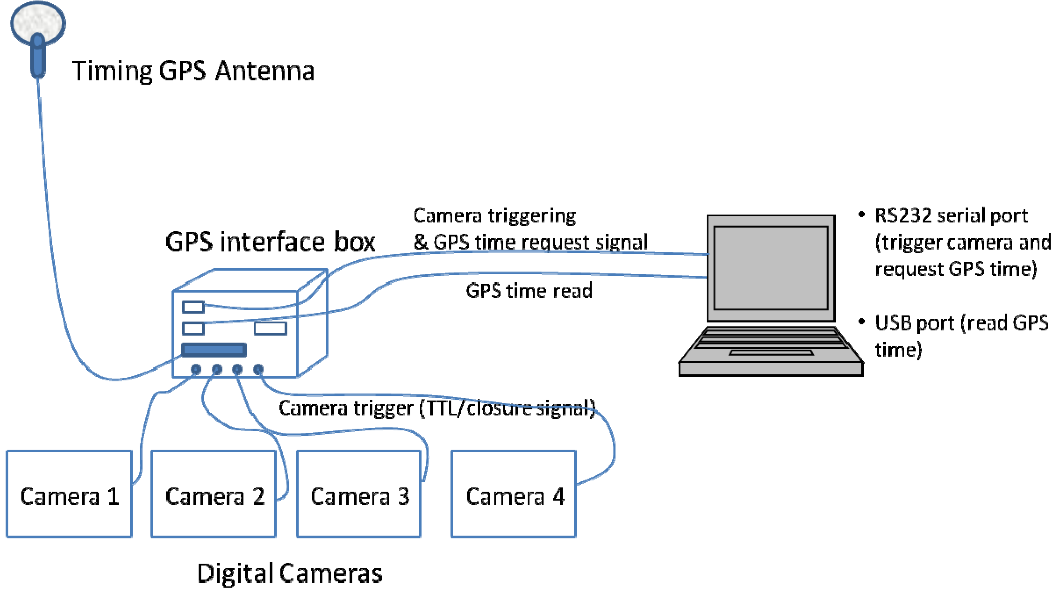 A different application was developed for the consumer-grade camera(s) image acquisition and synchronization with GPS time. The application utilizes hardware triggering signals created at certain frequency and sent to the camera and the timing GPS receiver through RS232 port. This simple and generic implementation allows the application to run from any laptop computer with RS232 port and is capable of handling multiple cameras at the same time.