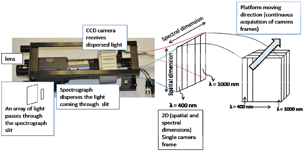 The hyperspectral sensor is composed of a V10E Specim ImSpector holographic grating [27], manufactured by Spectral Imaging Ltd (Finland). The grating spectrograph disperses the energy passing through a Schneider-Kreuznach Xenoplan (focal length = 17 mm; f-stop = 1.4) c-mount lens and entering a 30 micron width slit into different wavelengths. The dispersed energy is received by a digital camera attached to the back of the spectrograph. Several off-the-shelf digital cameras can be used in this setup. In our system, an Imperx IPX-2M30H-L was used and installed by Autovision Inc. (http://www.autovision.net/). Table 1 lists the basic specifications of the V10E ImSpector spectrograph and the Imperx IPX 2M30H-L camera. The energy entering the spectrograph slit is dispersed through the spectrograph optics into different wavelengths and captured by the Imperx camera’s two‑dimensional Charge-Coupled Device (CCD). One dimension on the CCD represents the spatial component and the other dimension represents the spectral component. Each image captured by the Imperx camera represents a line in the formed hyperspectral image. Images are built up line-by-line so that adjacent lines captured by the moving sensor form a hyperspectral image cube. Figure 2 shows a schematic diagram of the hyperspectral image data formation including light dispersion, frame acquisition by the digital camera and image formation through sensor mobility.