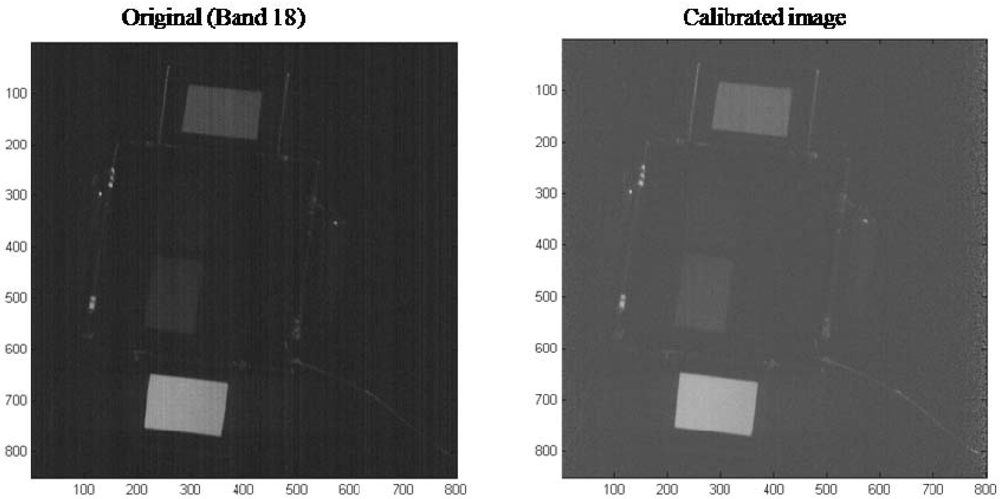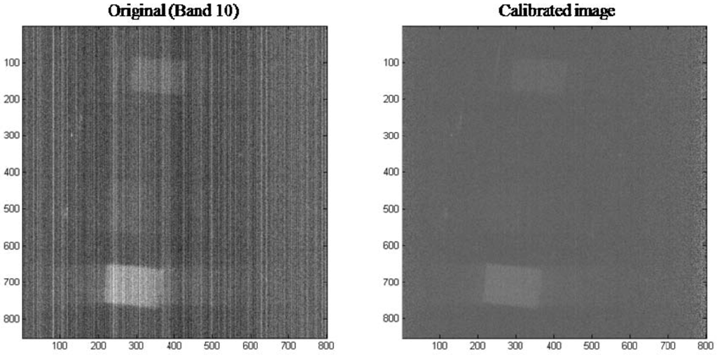 Figure 3 shows bands 10 (heavy stripes) and 18 (moderate stripes) of an image cube taken before and after applying the gain and offset calibration coefficients. The image shows that the appearance of striping was greatly reduced.