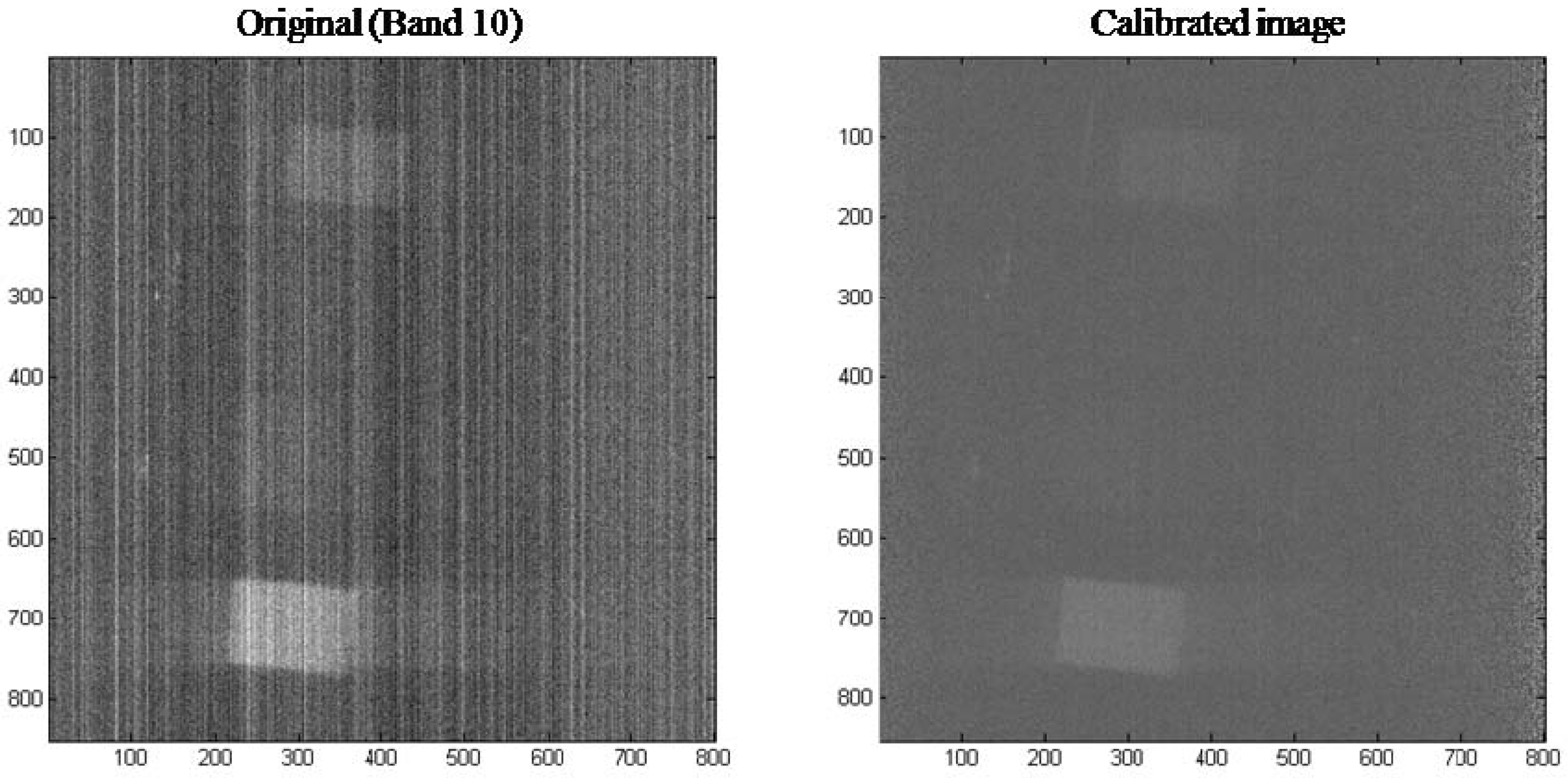 where, i = 1, 2, …L is the line in a single image band; k = 1, 2, ….N = 800 is the detector (pixel) number in a single band line; is the observed DN value, is the calibrated DN value; and is the residual error.