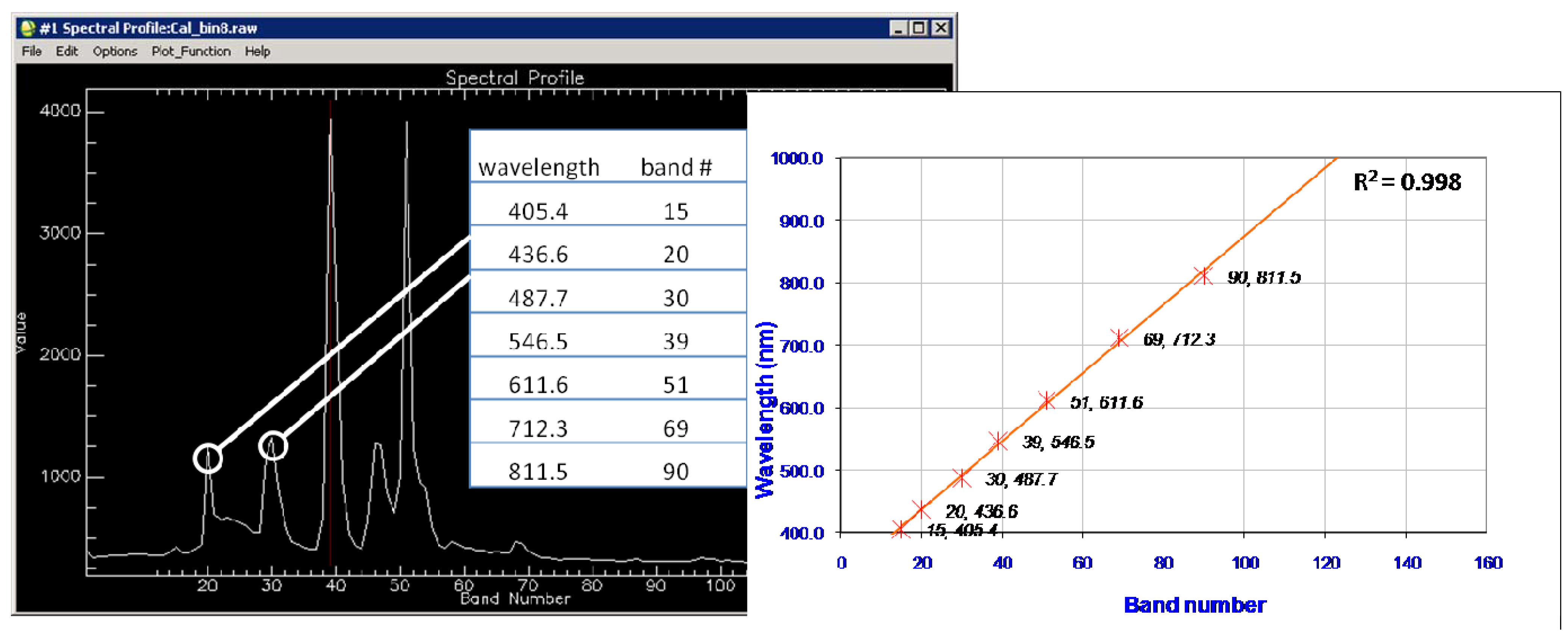 Empirical spectral calibration using Fluorescent light spectra (8 pixel spectral binning configuration). Fluorescent light spectra (left) and linear regression of wavelength against band number (right).
