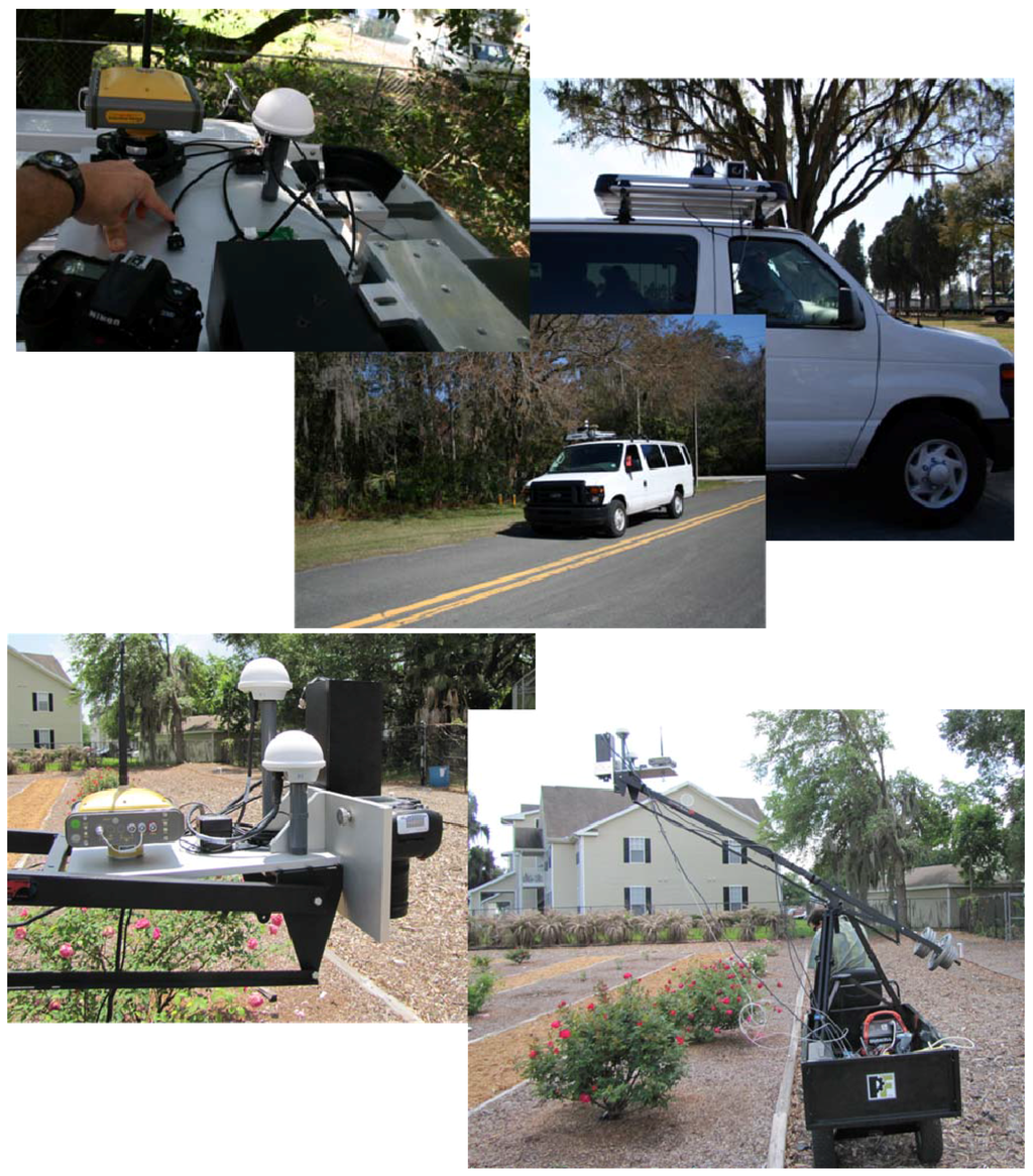 Our VMMS system was designed to fit two different ground-based mobile platforms: one for road right-of-way mapping and the other for precision agriculture applications. The system can be mounted on a motor vehicle (van) so that the cameras look to the side at the right-of-way objects. The precision agriculture imaging application was facilitated by mounting the imaging and navigation devices on a plate positioned on a crane. The crane tripod can be carried by a truck or a tractor. In this design, the cameras look downwards for vegetation (e.g., crop) imaging. Figure 5 shows the imaging and navigation equipment mounted on both platforms.