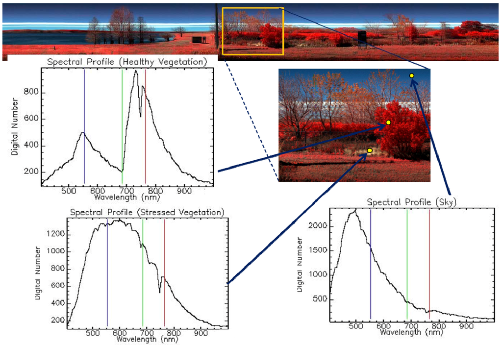 Vegetation characterization using multispectral and hyperspectral images is a topic of significant research interest. Spectral responses of plants are analyzed and used in many applications such as classifying vegetation [1]. Hyperspectral imagery measures the spectral response at each pixel in a series of narrow and adjacent wavelength bands. This continuous representation of the spectrum at each pixel facilitates many types of analysis. Hyperspectral imagery has been used in many applications including assessing plant stress [2], identifying invasive species [3], estimating water quality parameters of both open oceans [4,5] and turbid inland waters [6], agricultural crop classification and yield estimation [7,8], and characterization of ecosystems [9,10].