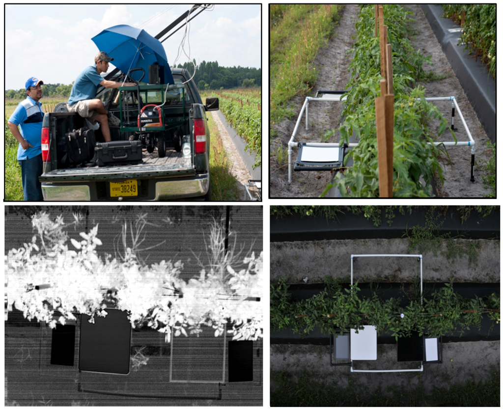 Two data sets were analyzed by our system to: (1) quantify tomato vegetation health and (2) estimate chlorophyll-a (chl-a) concentration in aquaculture ponds. The algorithms used in the analysis used individual narrow bands acquired by our hyperspectral sensor in the red and infrared regions of the spectrum. The tomato vegetation experiment was conducted to evaluate the use of our systems to detect and quantify bacterial disease in tomato vegetation. Our experiments involved capturing imagery on three different dates along the plant cycle at 4, 6, and 8 weeks age for five different trials under different management conditions and was accompanied by field evaluation accomplished by plant pathology experts. Figure 7 shows image acquisition of tomato field and calibration boards used for the image atmospheric calibration. The bottom left corner image is an image subset of a Normalized Difference Vegetation Index (NDVI) using two bands (λ = 668 and 736 nm).