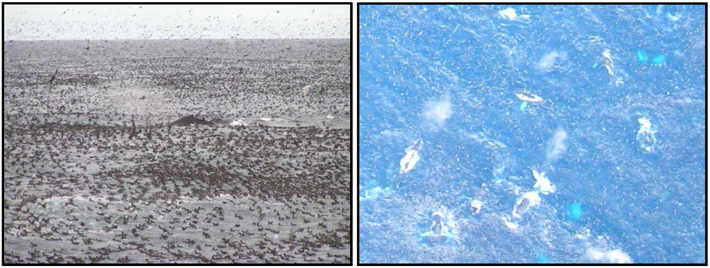 Photographs of foraging taken from the surface vessel and from the aircraft. In the left frame, the small dark objects on the surface are shearwaters, and there is a humpback whale diving in the center of the frame. See also the cover illustration on Issues 2–4, Volume 68, 2006 of Progress in Oceanography. In the right frame, the small light objects are seabirds, and seven humpback whales are visible.
