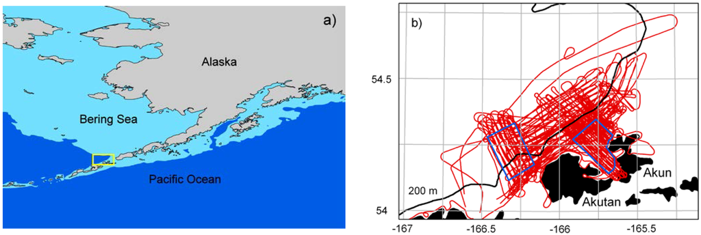 Study area in SE Bering Sea. (a) Chart of southwestern Alaska, showing the Bering Sea and Pacific Ocean, separated by the Alaska Peninsula and Aleutian Islands. The light and dark blue regions show where the water depth is <200 m and >200 m, respectively, and the location of the detailed chart is shown by the yellow rectangle. (b) A detailed chart of the region around Akutan and Akun Islands, with the 200 m bottom contour (black line), all flight tracks (red lines), and the ship’s preselected systematic acoustic survey areas (blue lines), with the slope area on the left and shelf on the right.