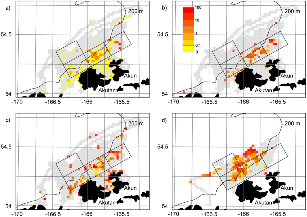 Spatial distributions of (a) birds, (b) marine mammals, (c) daytime fish, and (d) nighttime fish from aerial surveys. In each case, the relative density in each 2 km by 2 km bin was plotted as a percent of the highest value according to the logarithmic color scale in (b). Bins with no detections are in gray. The four rectangular boxes are those used for the hot-spot analysis, and the black line denotes the 200 m depth contour.