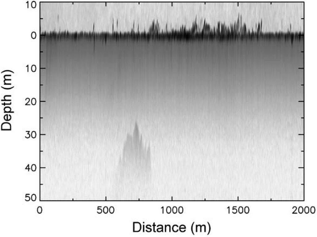 Gray-scale plot of lidar return as a function of depth and distance along the flight track for a 2,000 m segment of data during the large foraging event on 13 June.