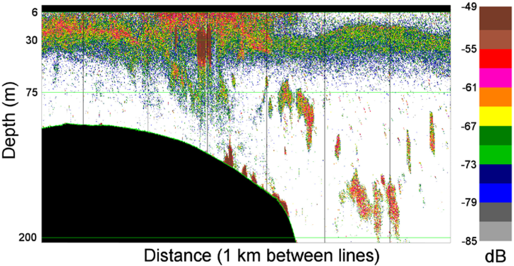 Echoview (v 4.90, Myriax Pty Ltd, 2010) was used to analyze the acoustic data to obtain volume backscatter (Sv, dB re: 1 m–1) and Area Backscatter Coefficient (ABC, m2 m−2) as an index of combined plankton and fish density. Files were inspected for bottom detection, vessel noise spikes, and electrical interference prior to processing. Data from a SeaBird SBE–19 Seacat Conductivity-Temperature-Depth (CTD) casts during the survey were used to estimate absorption coefficients [] and sound speed []. Vessel noise (−115 dB, Sv at 1 m) was removed from all data sets using linear subtraction [,]. A minimum Sv threshold of −82 dB was selected based on the calculated noise level at our maximum analytic depth of depth of 75 m. Samples with Sv values less than either our estimated vessel noise or our Sv minimum threshold were assigned −999 dB (effectively equivalent to zero backscatter in the linear domain; Myriax Pty Ltd, 2010). Acoustic data were divided into 100 m horizontal bins and two vertical bins: 6–30 m and 30–75 m. An average acoustic backscatter (ABC) value was calculated for the systematic shelf and slope surveys, the hot spot survey, and for all data (systematic + hot spot) based on the 6–30 and 30–75 m vertical bins.