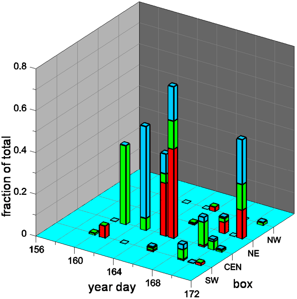 From the aerial survey data, several density estimates were calculated. First, lidar was used to estimate the density of fish school number (schools km−1) for the slope and shelf areas by the number of schools within each area divided by the total length of the flight track within each area. To account for differences in school size and density, we estimated the relative abundance of fish as the integral of the scattering strength over the school along the flight track. Second, using lidar and visual counts of foraging animals, we mapped the density of fish relative abundance (km−1), mammals (number km−1), and birds (number km−1) over the entire survey region with a spatial resolution of 2 km by 2 km. These quantities, the number of birds, and the number of mammals for each spatial bin, were divided by the length of the flight track within that bin to get a relative density. Finally, we identified three rectangular boxes within the region of highest densities for a day by day analysis of fish, seabird and marine mammal densities. These densities were estimated for a box in the center of the hot spot (CEN), one just to the northeast (NE), and one just to the southwest (SW). A fourth box (NW), adjacent to the others, but outside of the region of highest concentrations, was also included in the analysis.