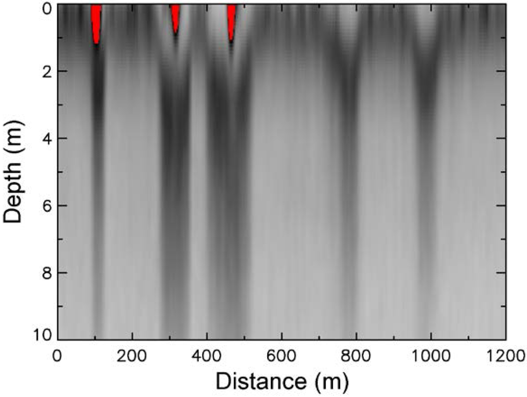 Gray-scale plot of lidar return as a function of depth and distance along the flight track for a 1,200 m segment of data during the large foraging event on 9 June. Contrast has been increased to increase visibility, resulting in saturation of the return from birds at the surface (red).