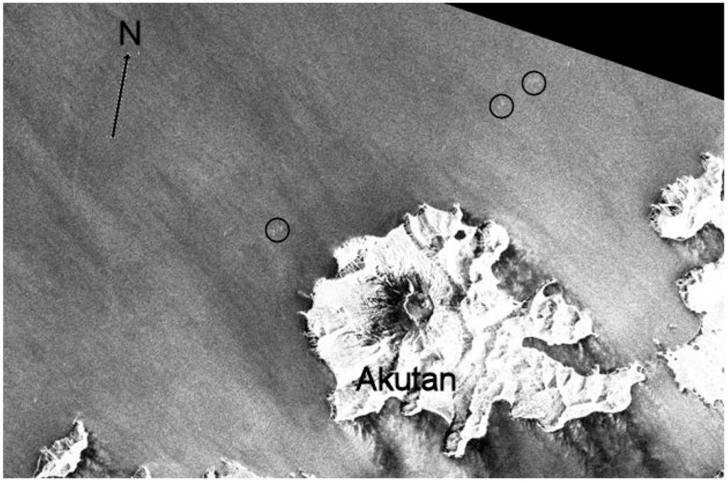 To determine if foraging events could be detected by satellite remote sensing, standard-mode (swath width = 100 km; resolution = 30 m) SAR data from the RADARSAT-1 satellite were obtained from the Alaska SAR Facility at the University of Alaska, and processed using software available from the same source. SAR images of the ocean surface show variations in radar reflectivity primarily caused by changes in sea surface roughness [,,]. These include ship wakes [] and schools of tuna [].