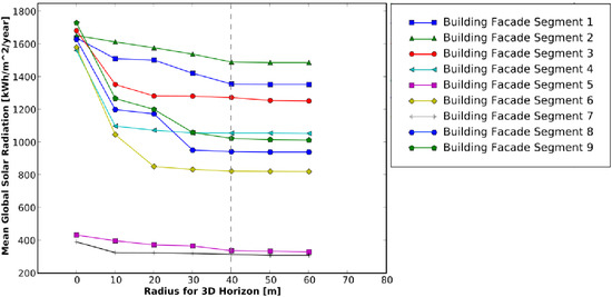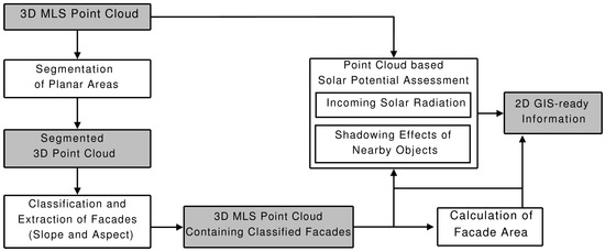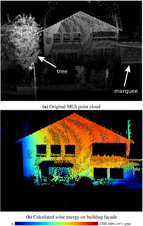 In recent years there has been an increasing demand among home owners for cost effective sustainable energy production such as solar energy to provide heating and electricity. A lot of research has focused on the assessment of the incoming solar radiation on roof planes acquired by, e.g., Airborne Laser Scanning (ALS). However, solar panels can also be mounted on building facades in order to increase renewable energy supply. Due to limited reflections of points from vertical walls, ALS data is not suitable to perform solar potential assessment of vertical building facades. This paper focuses on a new method for automatic solar radiation modeling of facades acquired by Mobile Laser Scanning (MLS) and uses the full 3D information of the point cloud for both the extraction of vertical walls covered by the survey and solar potential analysis. Furthermore, a new method isintroduced determining the interior and exterior face, respectively, of each detected wall in order to calculate its slope and aspect angles that are of crucial importance for solar potential assessment. Shadowing effects of nearby objects are considered by computing the 3D horizon of each point of a facade segment within the 3D point cloud. Full article