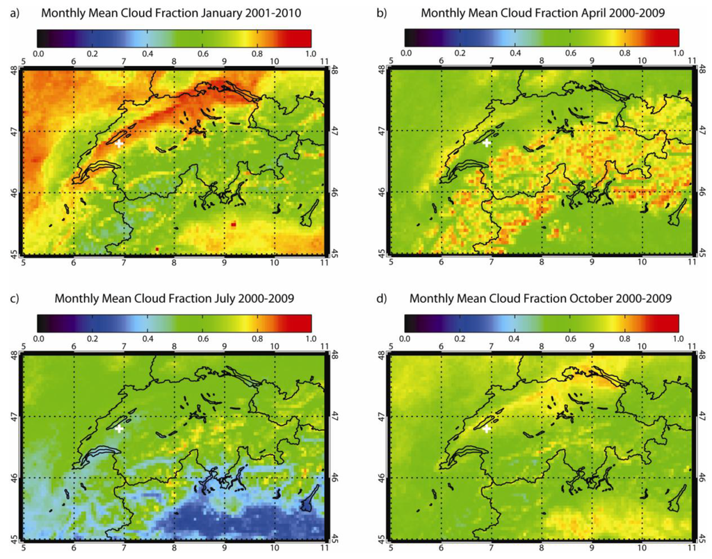 Subsequently, a 10-year cloud cover climatology was calculated for the period March 2000 until February 2010. Figure 2 shows the 10-year daytime monthly mean cloud fraction at 0.05° × 0.05° resolution for the area of Switzerland for January, April, July and October. The seasonal variation in cloud cover between winter, spring, summer and autumn is clearly visible. Furthermore, the difference between mountainous regions with lower cloud cover vs. low altitude regions (Swiss middleland, Northern Italy) is well apparent for January. The characteristic north-south gradient is particularly visible in July. The 10-year mean value of daytime monthly mean cloud fraction for the period March 2000 until February 2010 is 71% for January, 68% for April, 52% for July, and 65% for October, respectively.